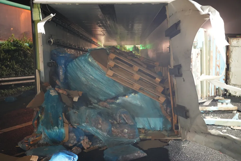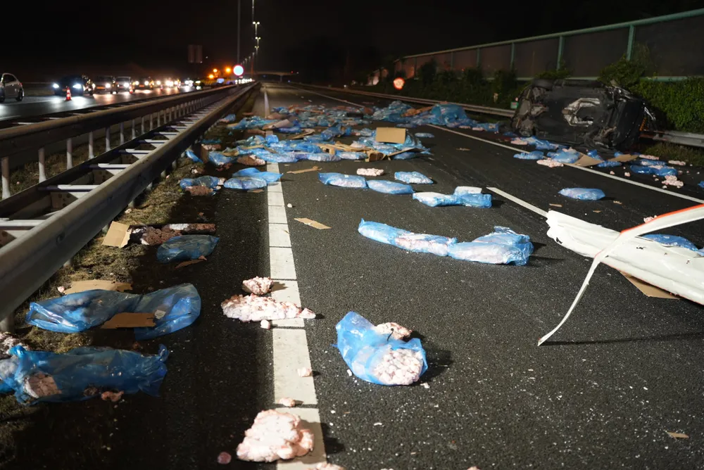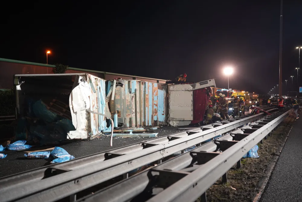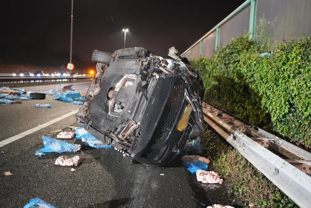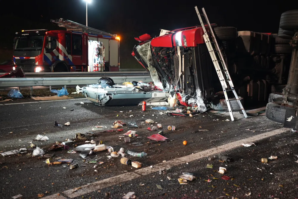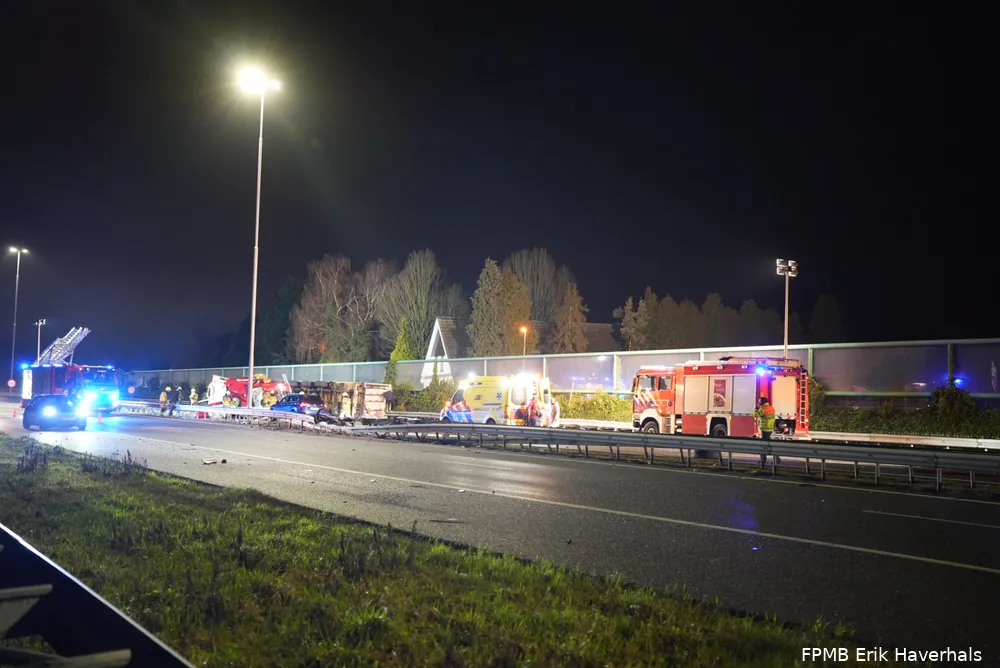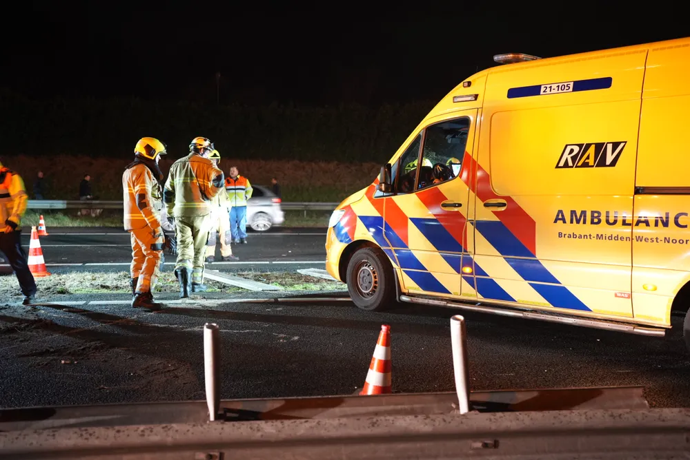 ELSHOUT - Door een ernstig ongeval tussen een vrachtwagen en een auto is de A59 ter hoogte van Elshout volledig afgesloten. Zowel de vrachtwagen als de auto liggen gekanteld op het wegdek. De vrachtwagen vervoerde kippenvlees, wat nu verspreid ligt over de snelweg.