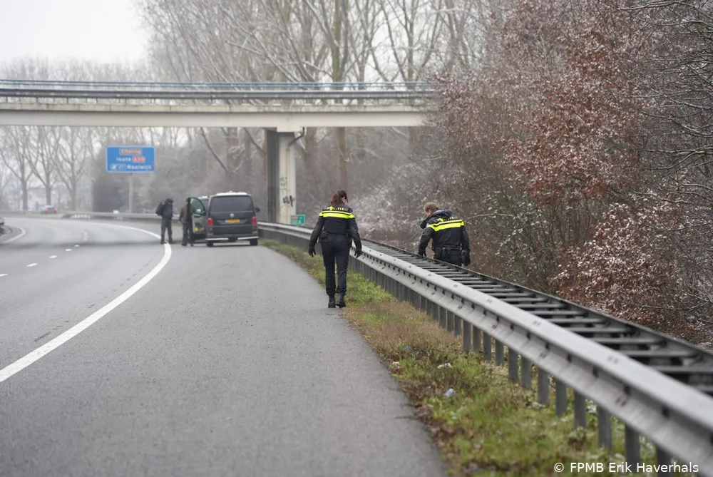 Agenten zijn met drie speurhonden bezig in de bermen langs de A59. Daarbij wordt gezocht naar mogelijke sporen van de verdachten en naar de route die zij na het incident hebben afgelegd.