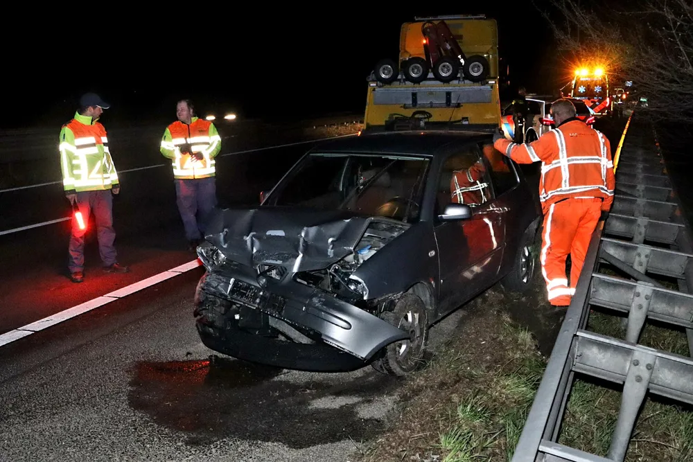 Een auto raakte om een nog onbekende reden de vangrail. Hierbij raakte minstens één persoon gewond. Vanwege het ongeval werd één rijstrook afgesloten voor het verkeer. Een bergingsbedrijf heeft de beschadigde auto weggehaald. De auto is total loss verklaard.