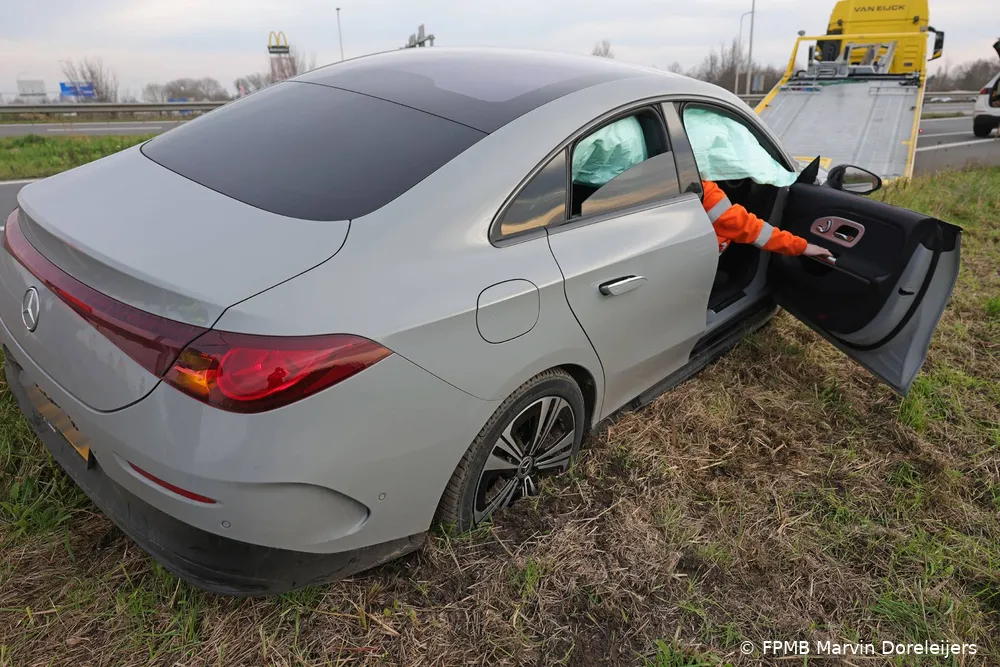 De bestuurder van een Mercedes-Benz, die pas enkele maanden oud was, verloor in een bocht bij de afrit de macht over het stuur. De auto kantelde en kwam naast de rijbaan op zijn zijkant tot stilstand. Door de ligging van het voertuig kon de bestuurder niet zelfstandig uitstappen.