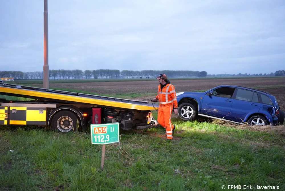 WAALWIJK – Vrijdagochtend is op de A59 richting Hooipolder een personenauto in de sloot beland na een aanrijding met vermoedelijk een busje. Het ongeval gebeurde tussen Waalwijk en Sprang-Capelle. De bestuurder van de auto wist op eigen kracht uit het voertuig te komen en raakte niet gewond.