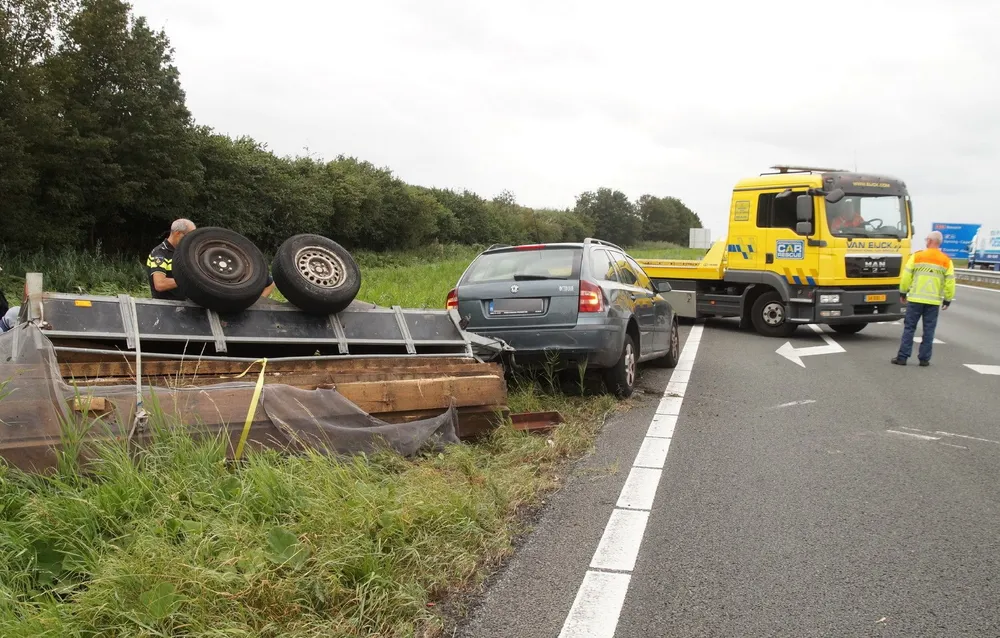SPRANG-CAPELLE - Op de A59 bij Sprang-Capelle is woensdagmiddag een personenauto met aanhanger geschaard. De aanhanger was geladen met houten balken. Er is niemand gewond geraakt.