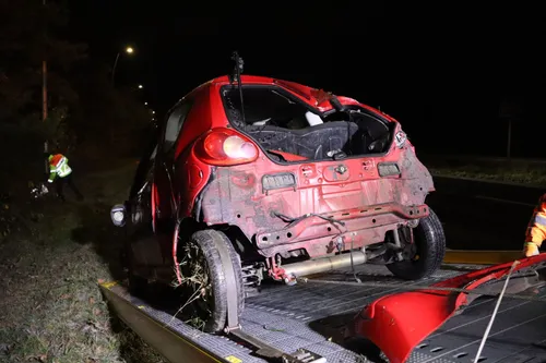 De zwaar beschadigde auto is door een bergingsbedrijf weggehaald. Gezien de schade moet de impact van het ongeluk aanzienlijk zijn geweest.