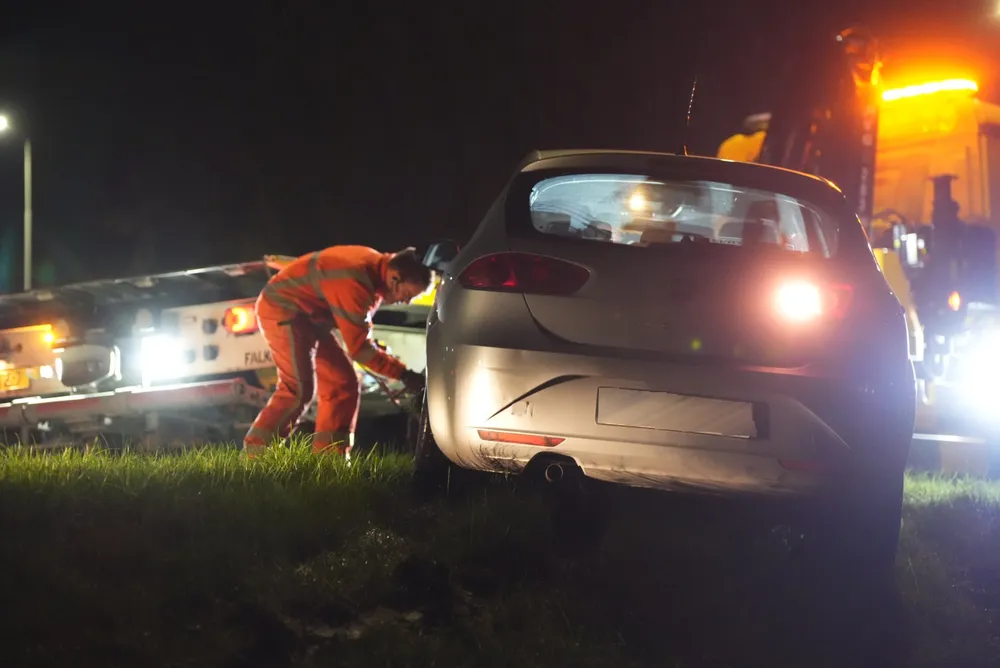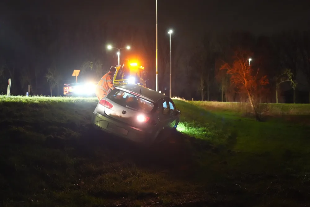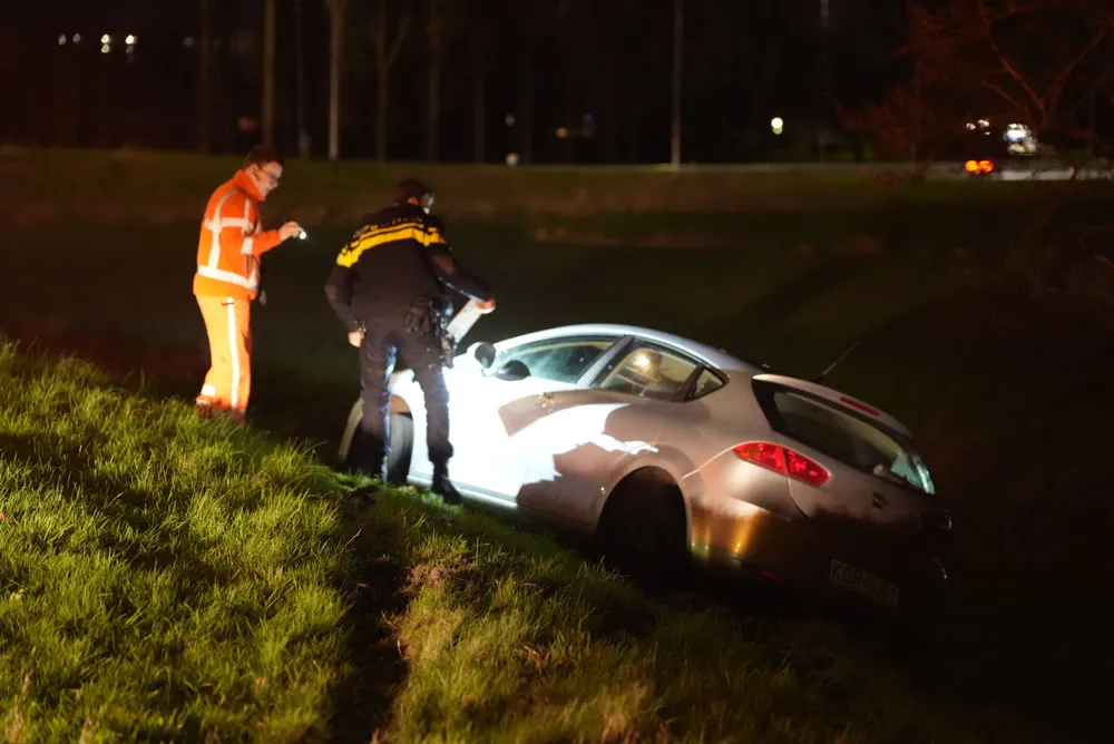 De auto van de man raakte een verkeersbord en kwam tot stilstand op het talud. Na een blaastest werd de man aangehouden en meegenomen naar het politiebureau voor een ademanalyse.