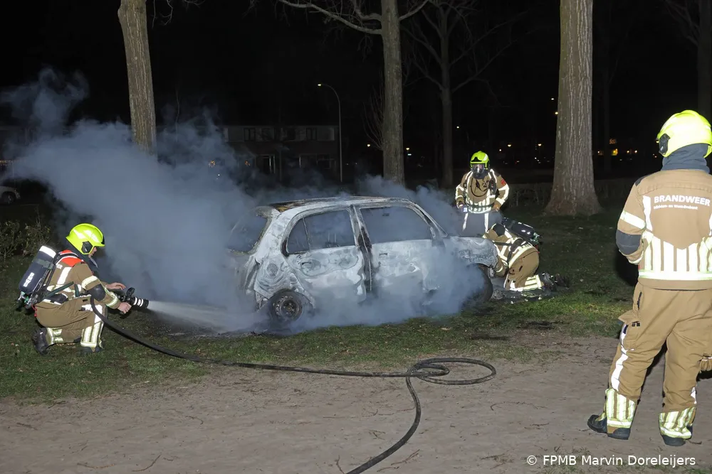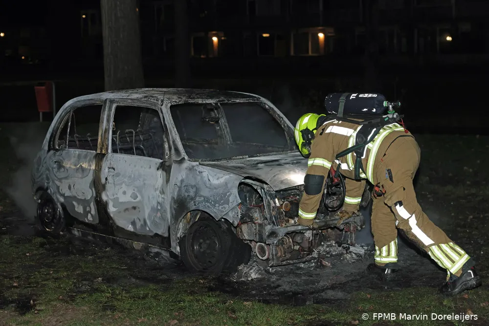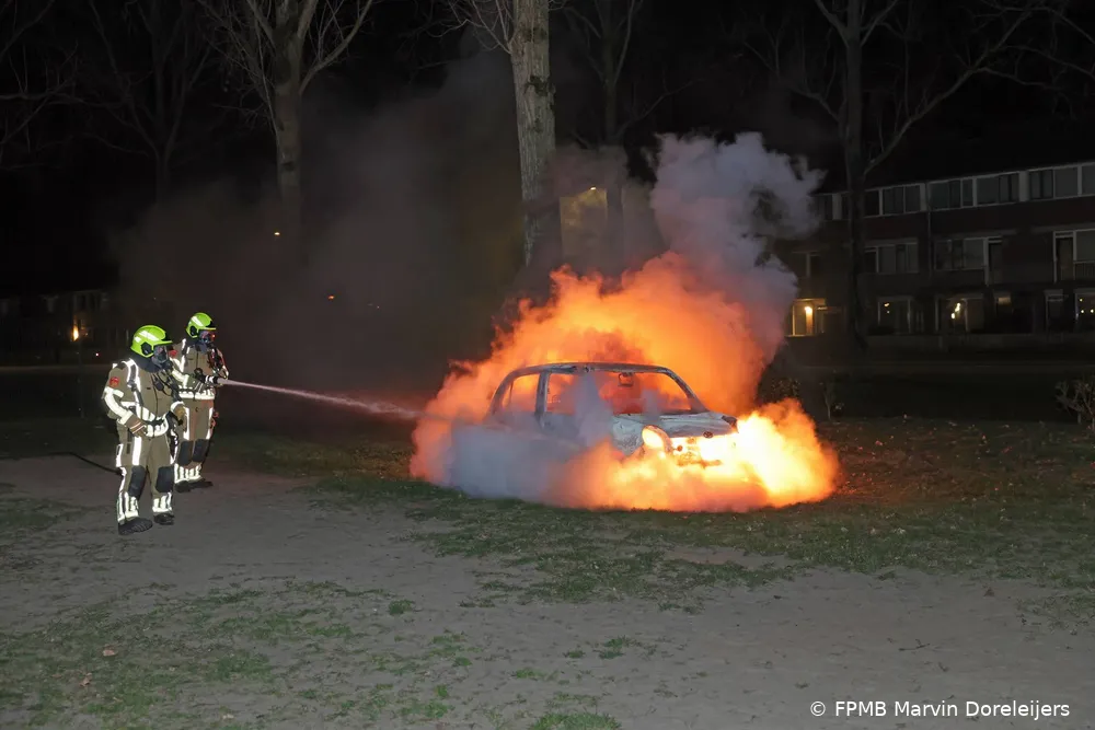 Auto volledig uitgebrand op grasveld Mendelssohnstraat Waalwijk