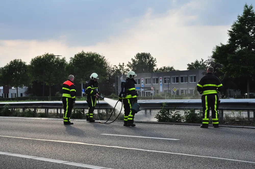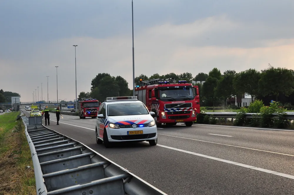 De vangrail moet gerepareerd worden, maar daar hoeft de snelweg niet afgesloten voor te blijven. De auto wordt weggetakeld.