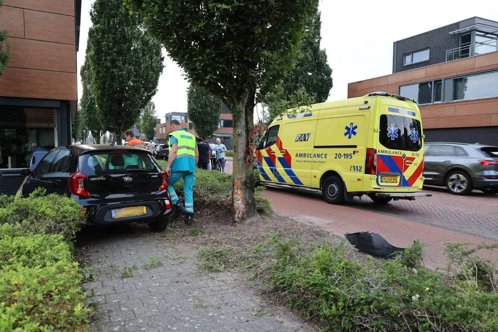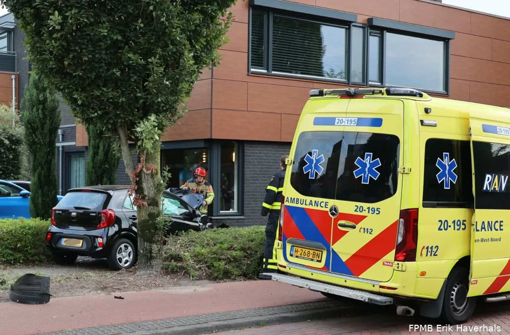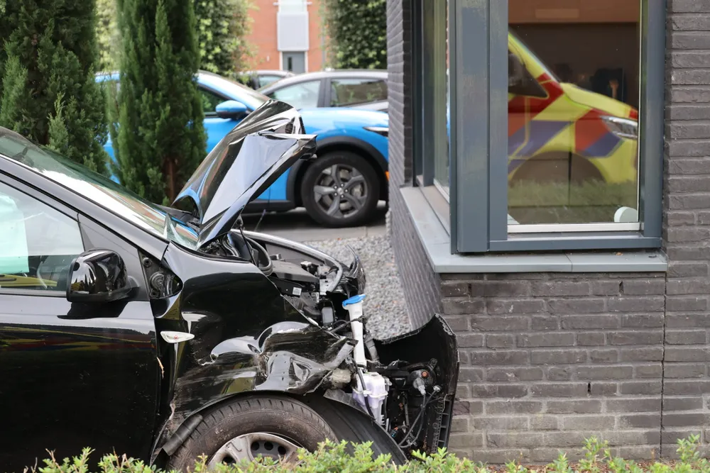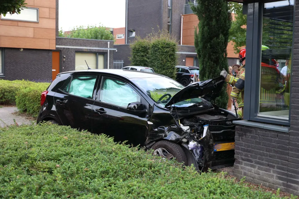De bestuurder is met een ambulance naar het ziekenhuis gebracht. De brandweer heeft de auto veilig gesteld. De woning liep geen schade op. Een takelbedrijf komt de auto takelen.