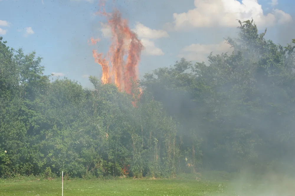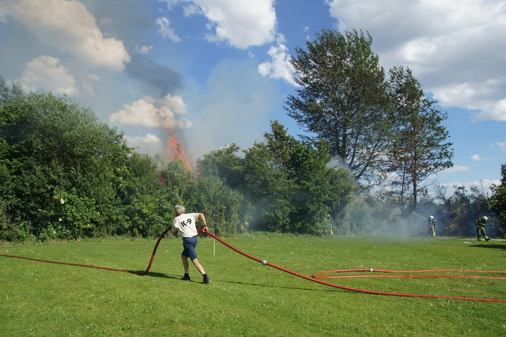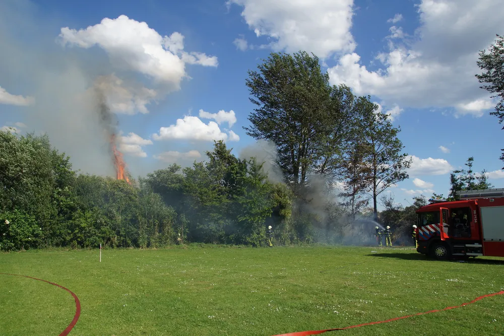 De brand begon als een kleine bermbrand, maar sloeg snel over naar het schuurtje van de Hondenvereniging. Daar sloegen de vlammen al snel uit. De metershoge vlammen en zwarte rookwolken kwamen boven de bomen uit.
