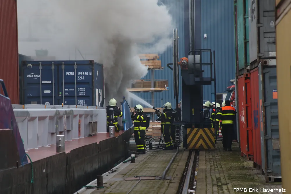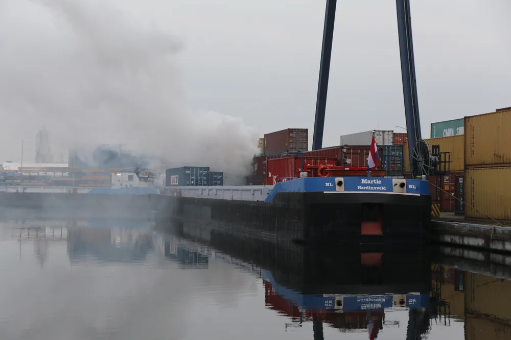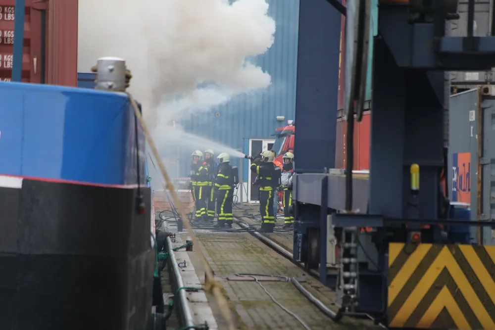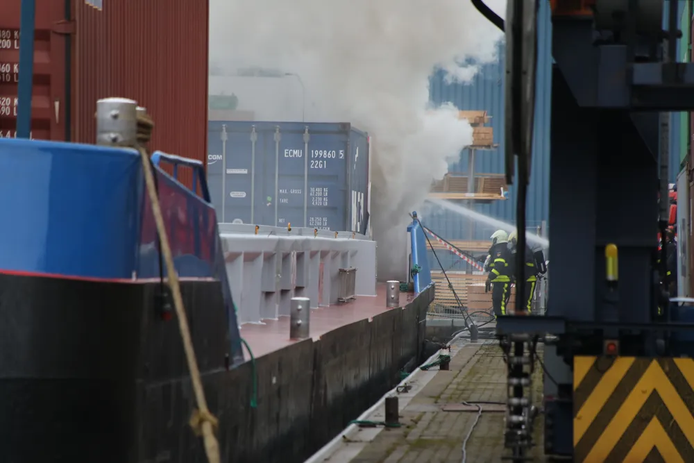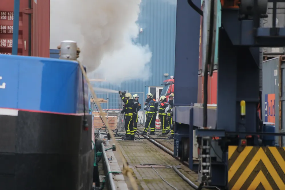 De brandweer is met meerdere bluswagens ter plaatse om het vuur te bestrijden. Het vuur woedt in de woon- en leefruimte van het schip. Bij de brand komt veel rook vrij. Het containerschip is afkomstig van ROC Overslagbedrijf.
