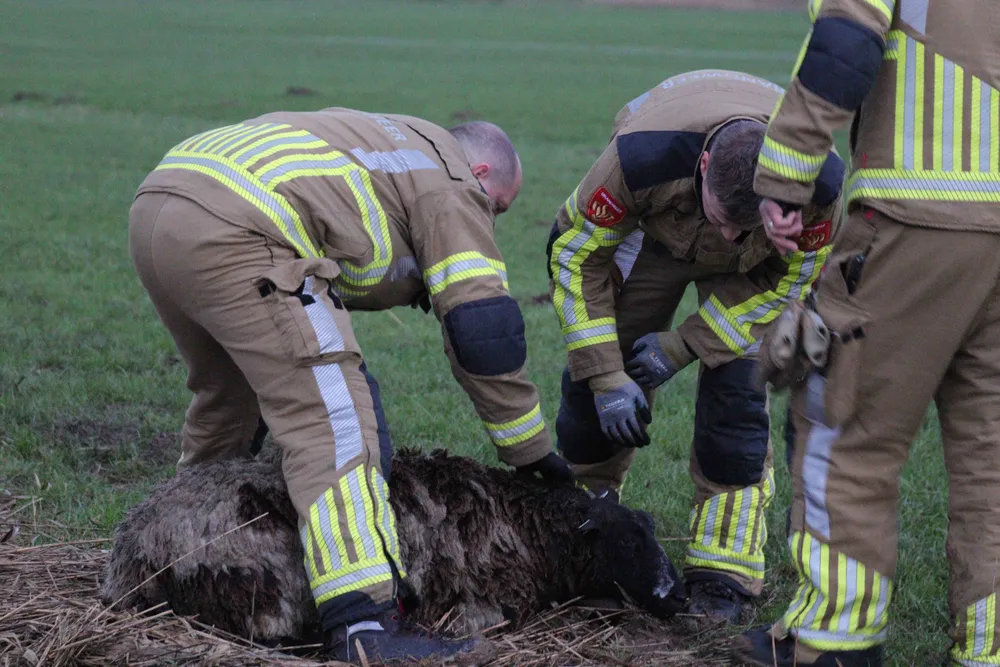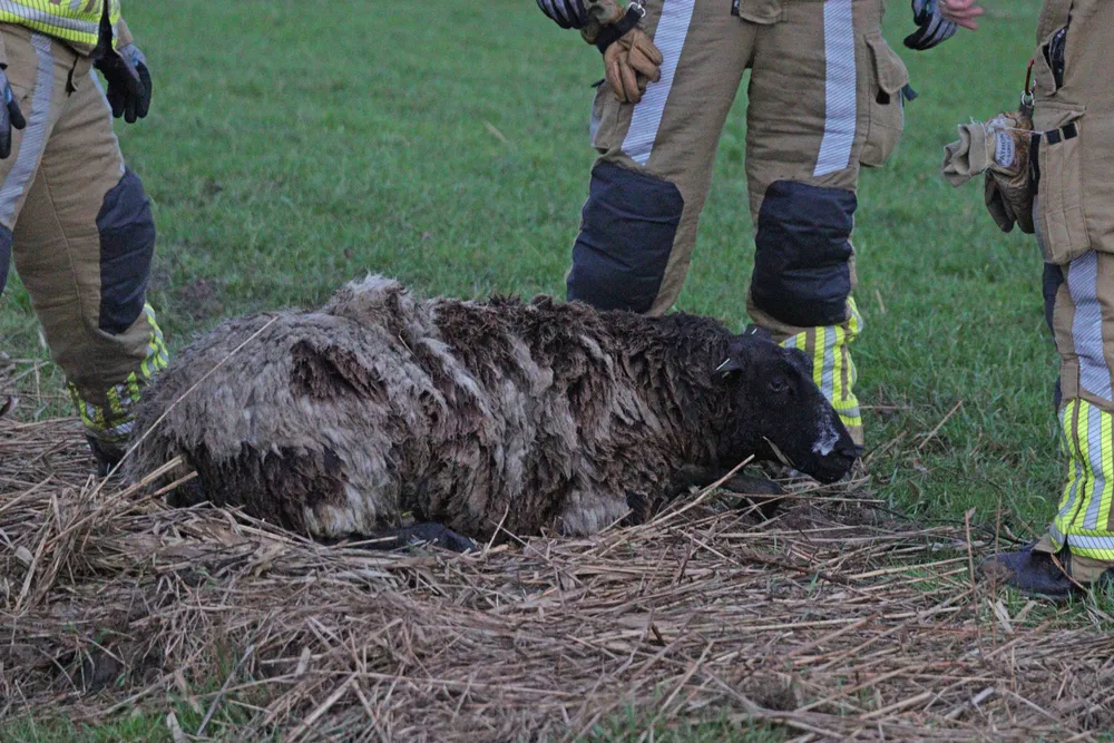 De brandweer moest een flink stuk over een weiland lopen om bij het schaap te komen. Het schaap werd gelukkig snel uit het koude water gehaald. Het dier was helemaal onderkoeld geraakt en had waarschijnlijk al langere tijd in het water gelegen. Eenmaal op het droge kon het schaap niet op zijn poten staan.