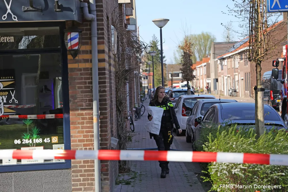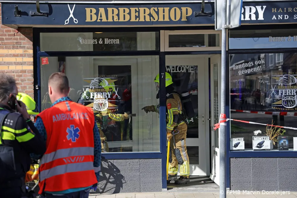 Om aangrenzende panden te inspecteren, moest de brandweer de deur van een naastgelegen kapperszaak forceren. Met een rookverdrijver werd de aanwezige rook uit de panden geblazen.