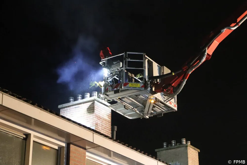 Met behulp van een hoogwerker werd het schoorsteenkanaal geveegd. In het kanaal was veel vuur zichtbaar en er kwam flinke rookontwikkeling vrij. De straat werd tijdelijk afgesloten zodat de hulpdiensten veilig hun werk konden doen.
