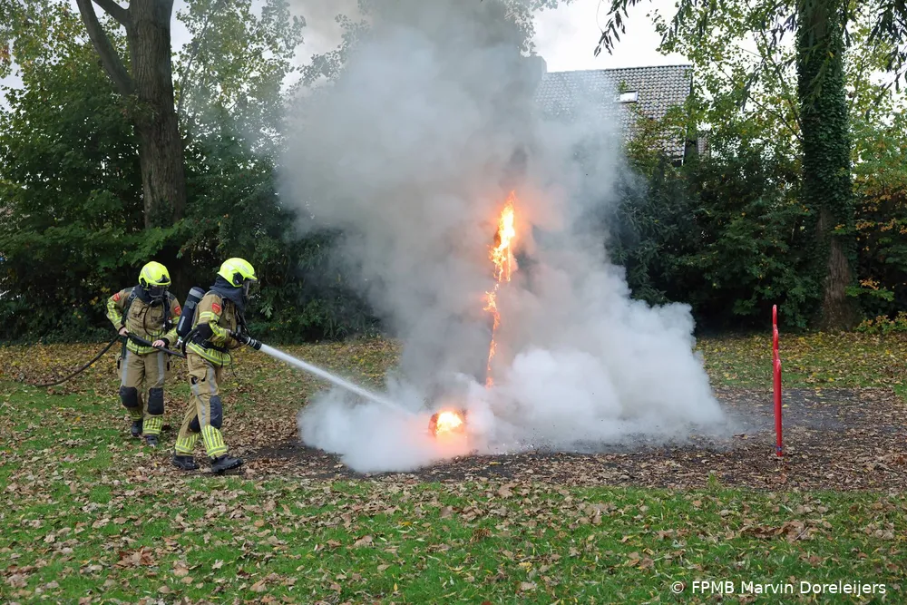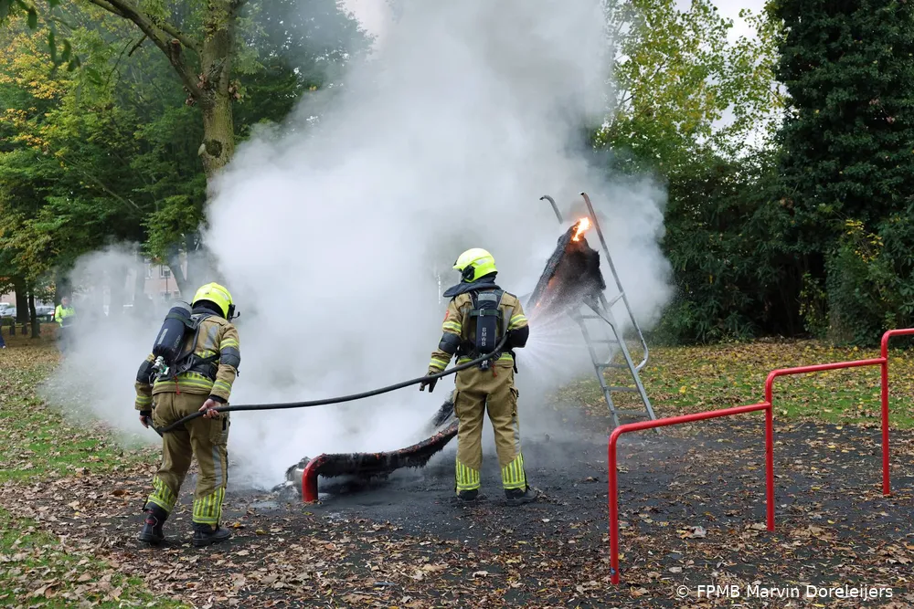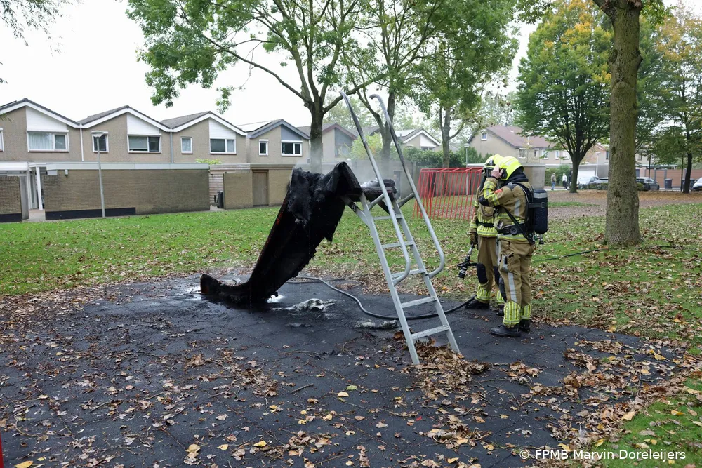 De brandweer van Waalwijk had het vuur snel onder controle, maar het speeltoestel raakte volledig verwoest. Van de glijbaan bleef weinig meer over dan een verkoold frame.