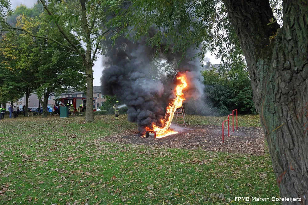 WAALWIJK - Op woensdag 15 oktober, rond 16:00 uur, brak brand uit op de speelplaats aan het Willaertpark. Een glijbaan stond volledig in brand, waarbij dikke zwarte rookwolken boven de woonwijk uittrokken. Omwonenden kwamen kijken wat er aan de hand was, terwijl de brandweer onderweg was.