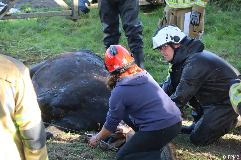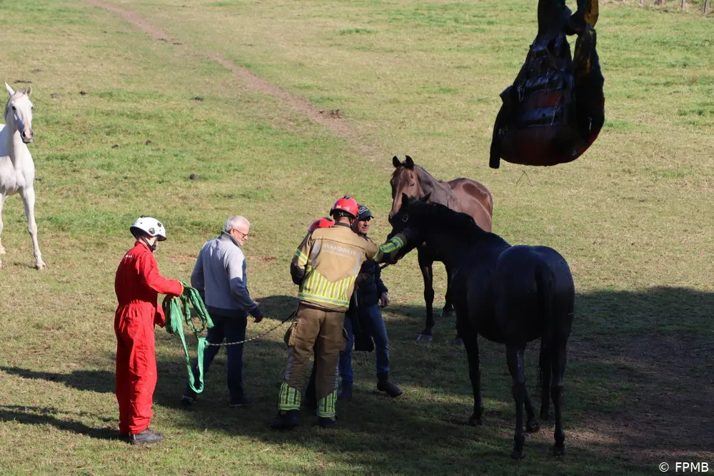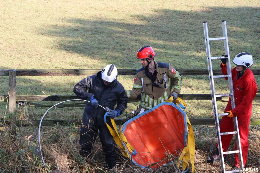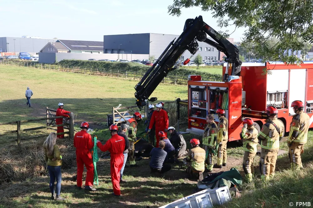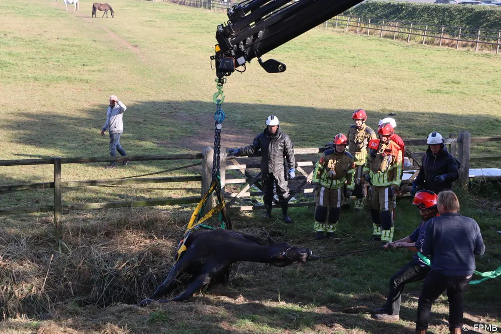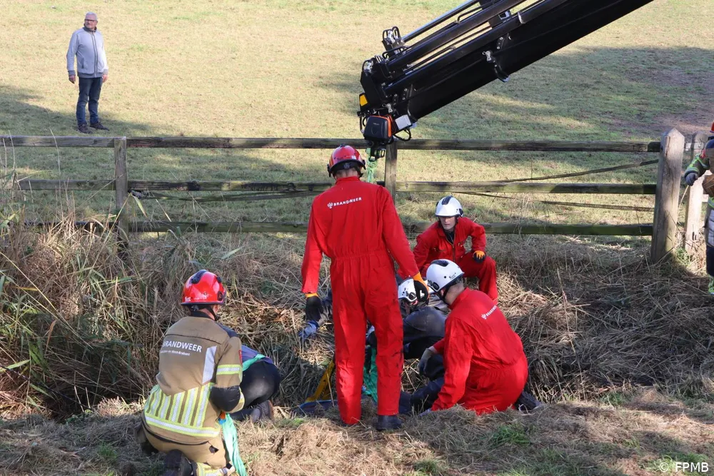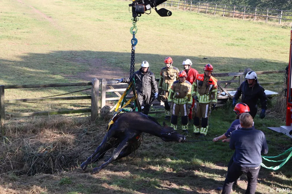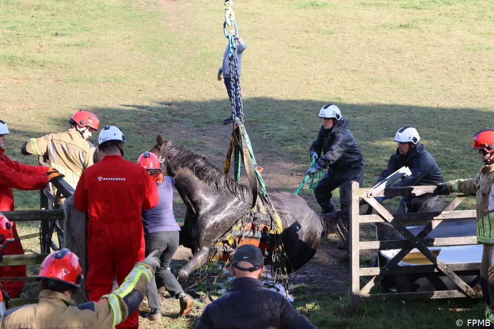 Na voorbereidingen wist de brandweer het paard met behulp van de kraan voorzichtig uit de sloot te tillen. Het dier werd in het weiland neergelegd om even bij te komen van de inspanning. Al snel stond het weer op de benen.