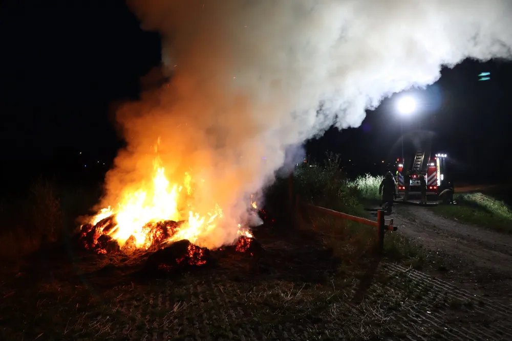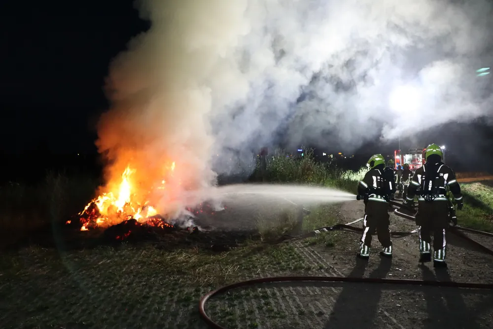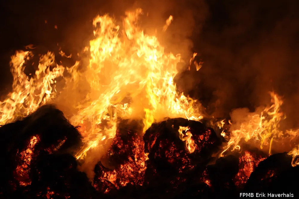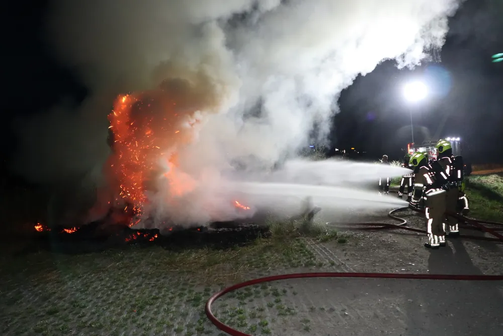 Een flinke hooiberg stond in brand. De vlammen sloegen metershoog de lucht in en er kwam veel rook vrij. Het vuur liet na het blussen een flinke schroeiplek achter. Over de oorzaak van de brand is niets bekend.