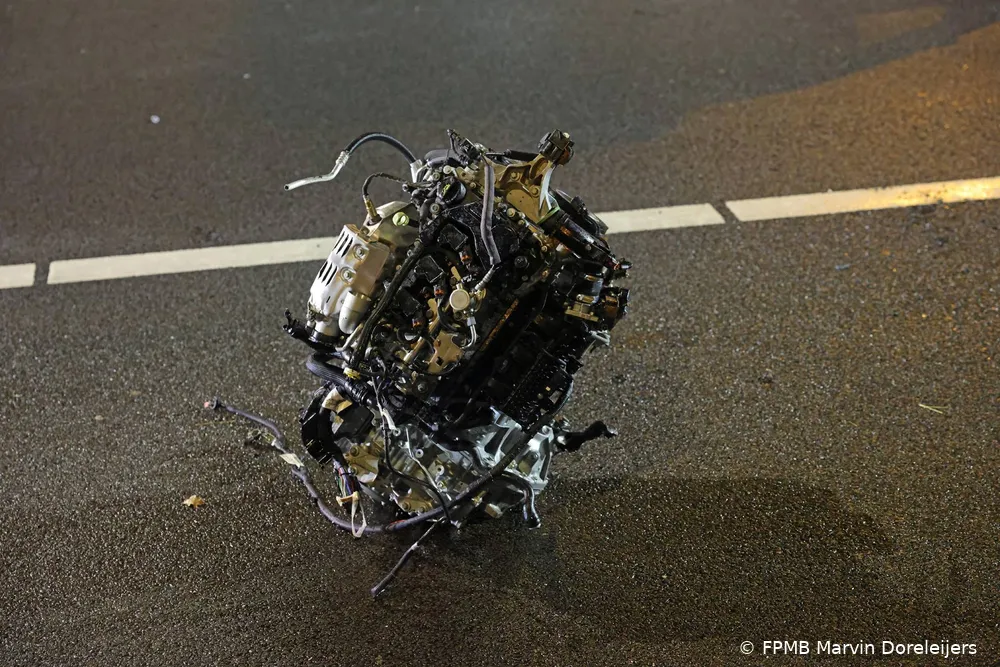 Beide voertuigen raakten zwaar beschadigd en kwamen tientallen meters uit elkaar tot stilstand. Het motorblok van één van de auto’s werd door de kracht van de botsing uit het voertuig geslagen en belandde verderop op het wegdek.
