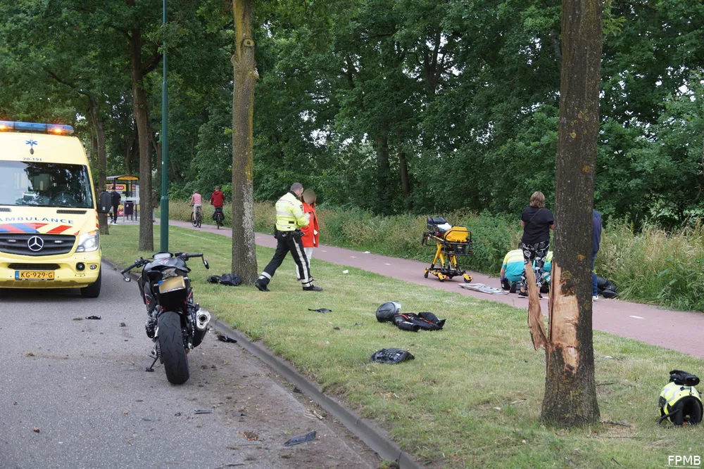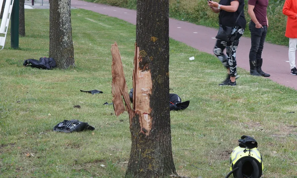 De motorrijder verloor de macht over het stuur en schampte tegen de boom aan de kant van de weg, waarna hij op het fietspad terechtkwam.