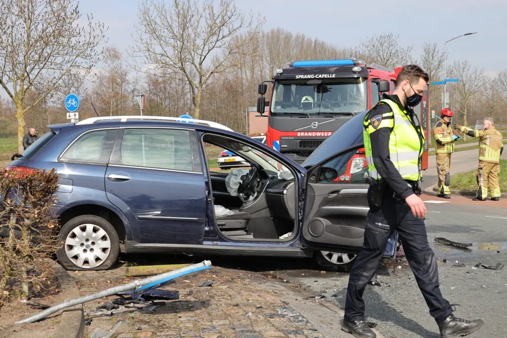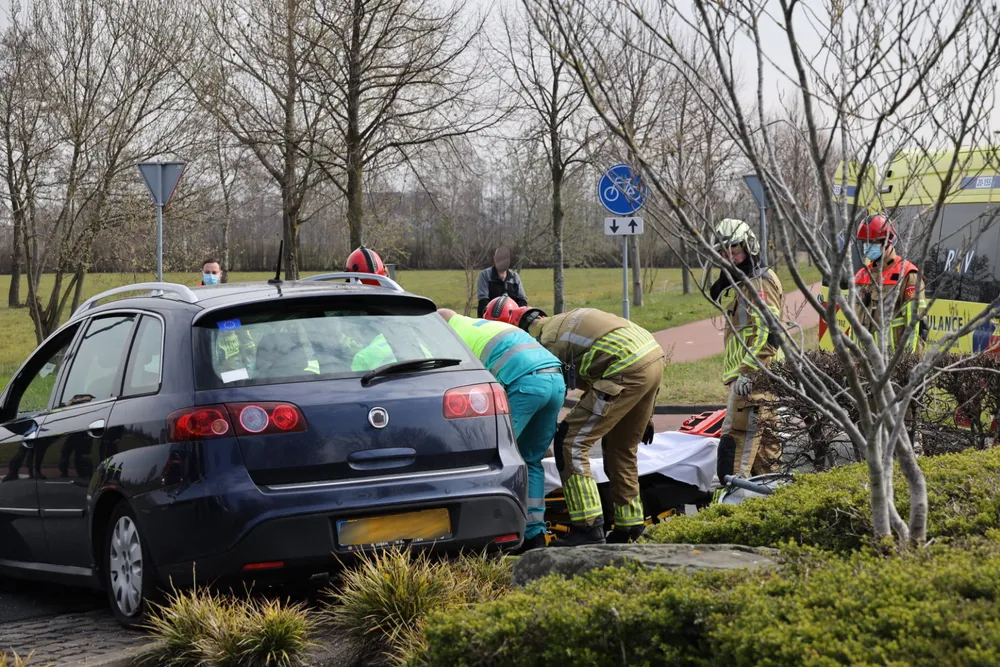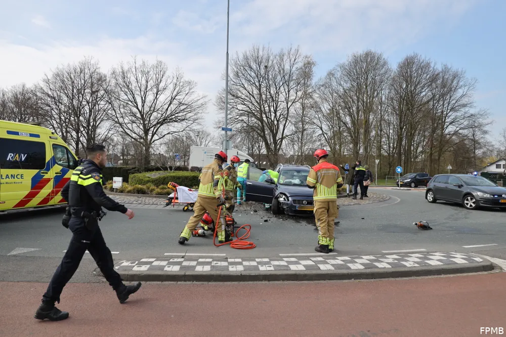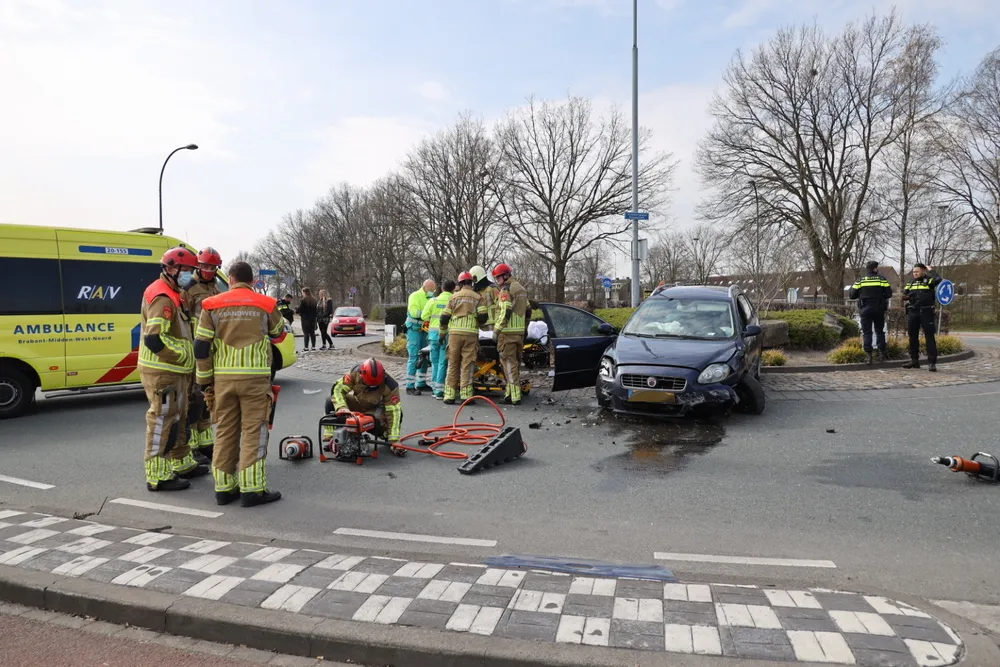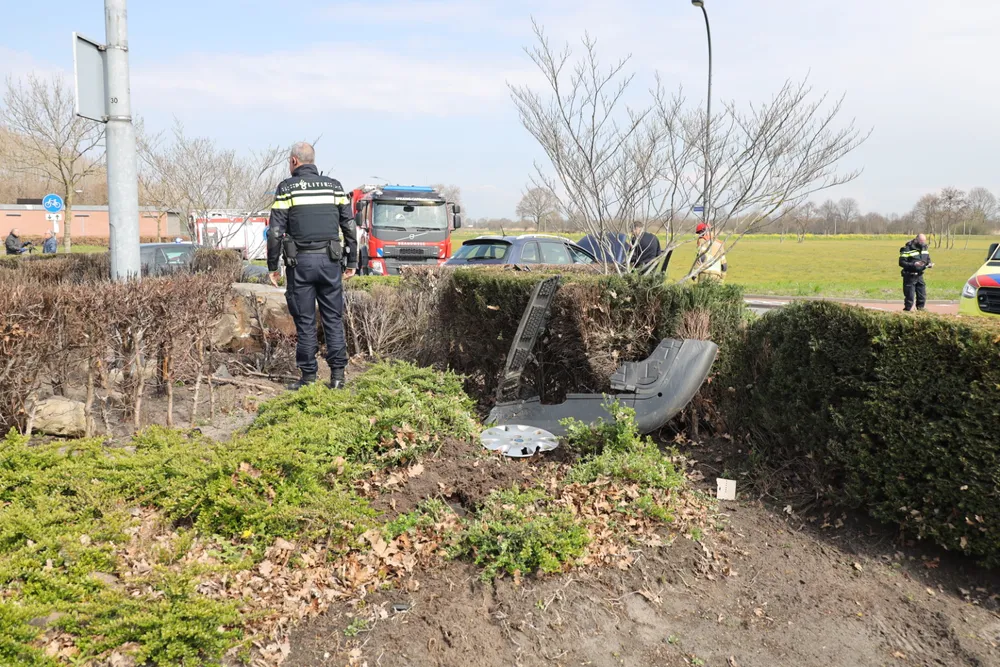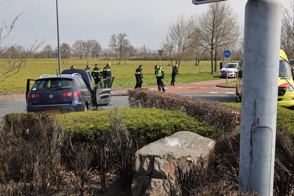 Ze kwam met haar auto aan de andere kant van de rotonde tot stilstand. De vrouw is met onbekend letsel overgebracht naar een ziekenhuis.