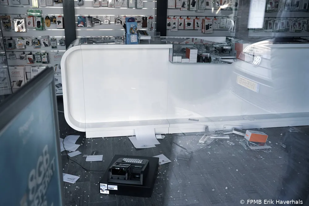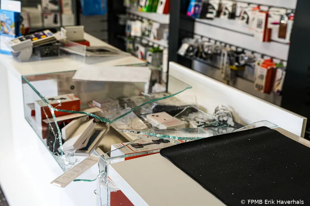 Door het inbraakalarm, dat een rookmachine activeerde, konden de inbrekers slechts in het voorste gedeelte van de winkel komen. Daar sloegen ze een vitrinekast en een glazen kast aan de toonbank in. Uit de kast namen ze enkele gebruikte GSM-toestellen mee, evenals de kassalade met een onbekend bedrag aan wisselgeld.