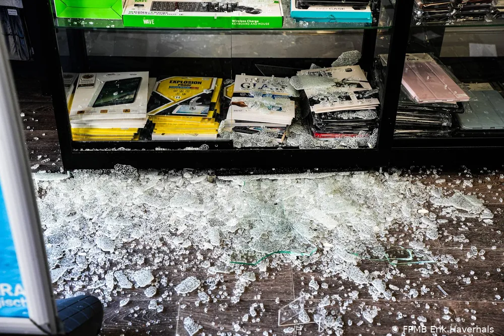 De schade in de winkel is groot en de eigenaar reageerde ontdaan op de inbraak. Hij is direct begonnen met opruimen om de zaak zo snel mogelijk weer te kunnen openen.