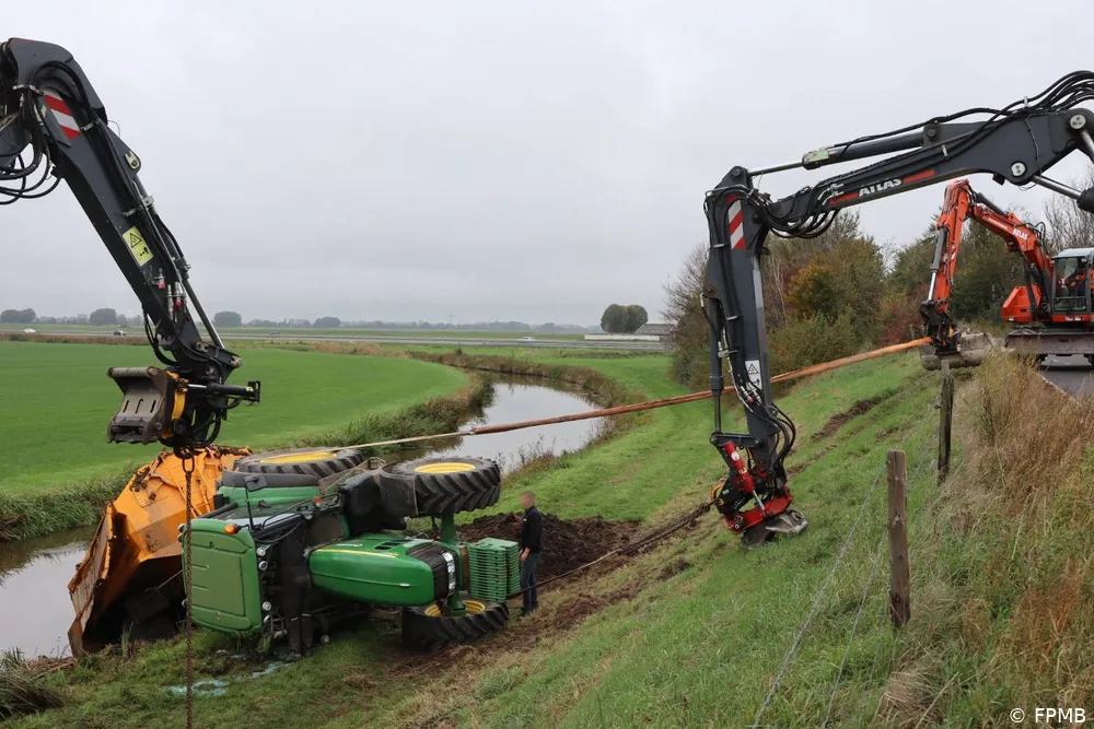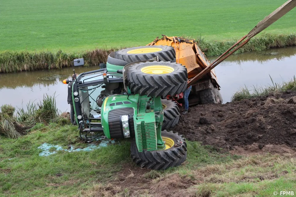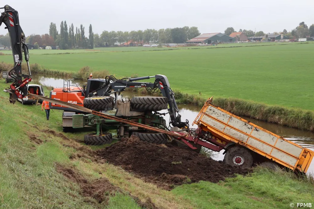 De bestuurder verloor door onbekende oorzaak de macht over het stuur en kwam onder aan de dijk tot stilstand. De aanhanger, volgeladen met grond, lag gedeeltelijk in het water, terwijl de tractor zelf op zijn kant terechtkwam.