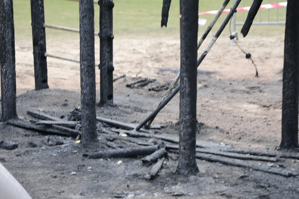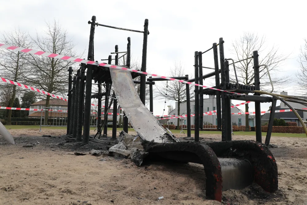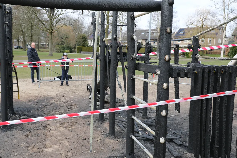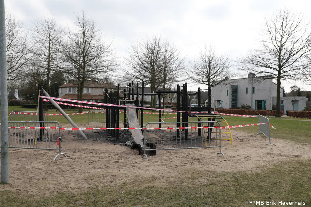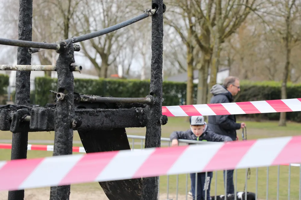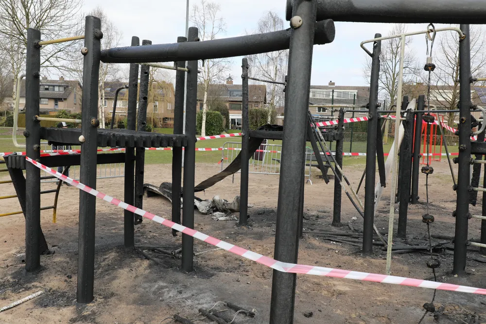 Gisteravond is het complete speeltoestel aan de Frans Halslaan in Waalwijk door brand verwoest. De gemeente heeft er hekken geplaatst met afzetlint om te voorkomen dat de jeugd er toch op gaat spelen.