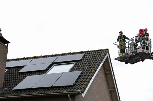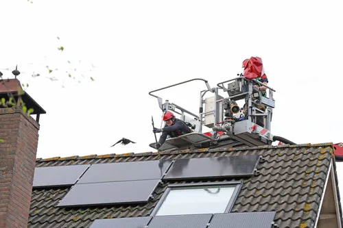 Rond 19:15 uur merkte een bewoner op dat er een vogel klem zat onder de zonnepanelen op het dak van zijn woning. De dierenambulance was al snel ter plaatse en schakelde de hulp in van de brandweer. Die kwam met een hoogwerker om het dier te helpen.