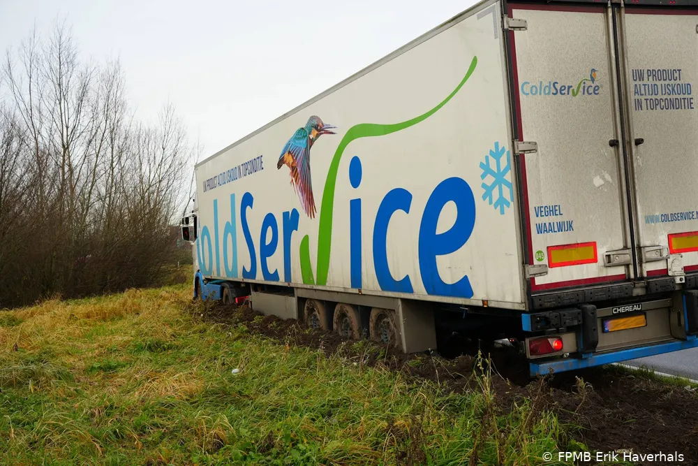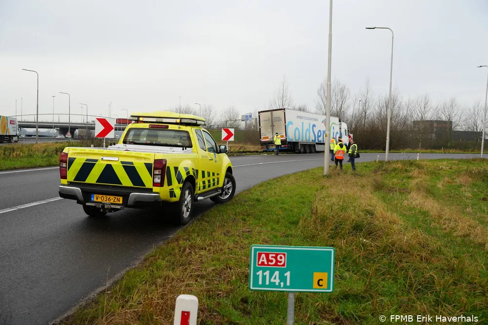 WAALWIJK - Op vrijdagmorgen 31 januari omstreeks 11:15 uur is een vrachtauto diep in de berm terechtgekomen bij de afrit van de A59, nadat de bestuurder de bocht niet goed had genomen.