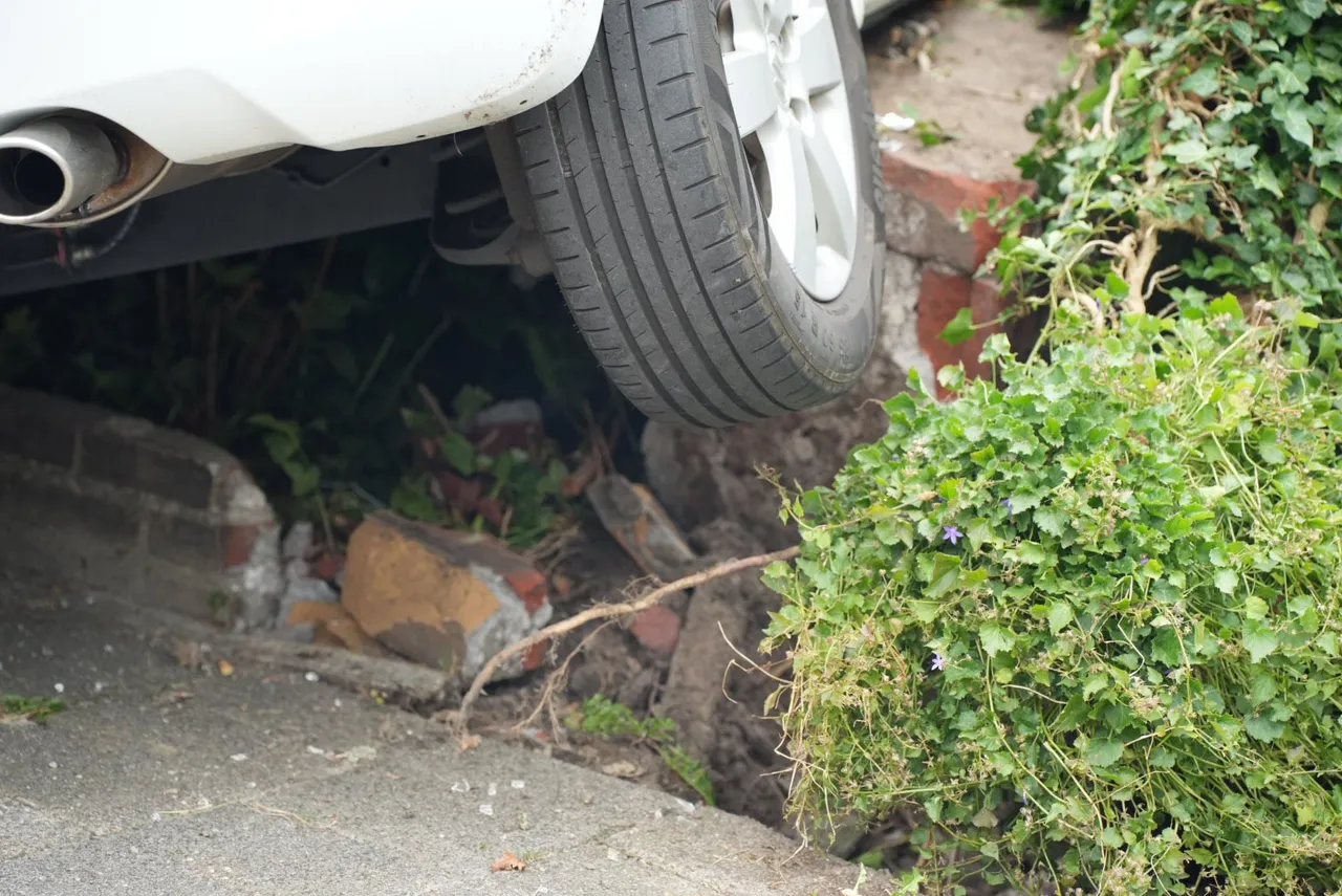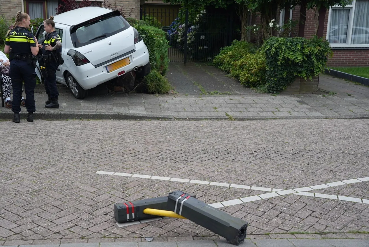 Hierdoor reed ze door de poort heen, botste tegen een muur, reed vervolgens twee palen uit de grond, stak de straat over, reed over een paal en belandde uiteindelijk in een tuin, waar de auto tot stilstand kwam.