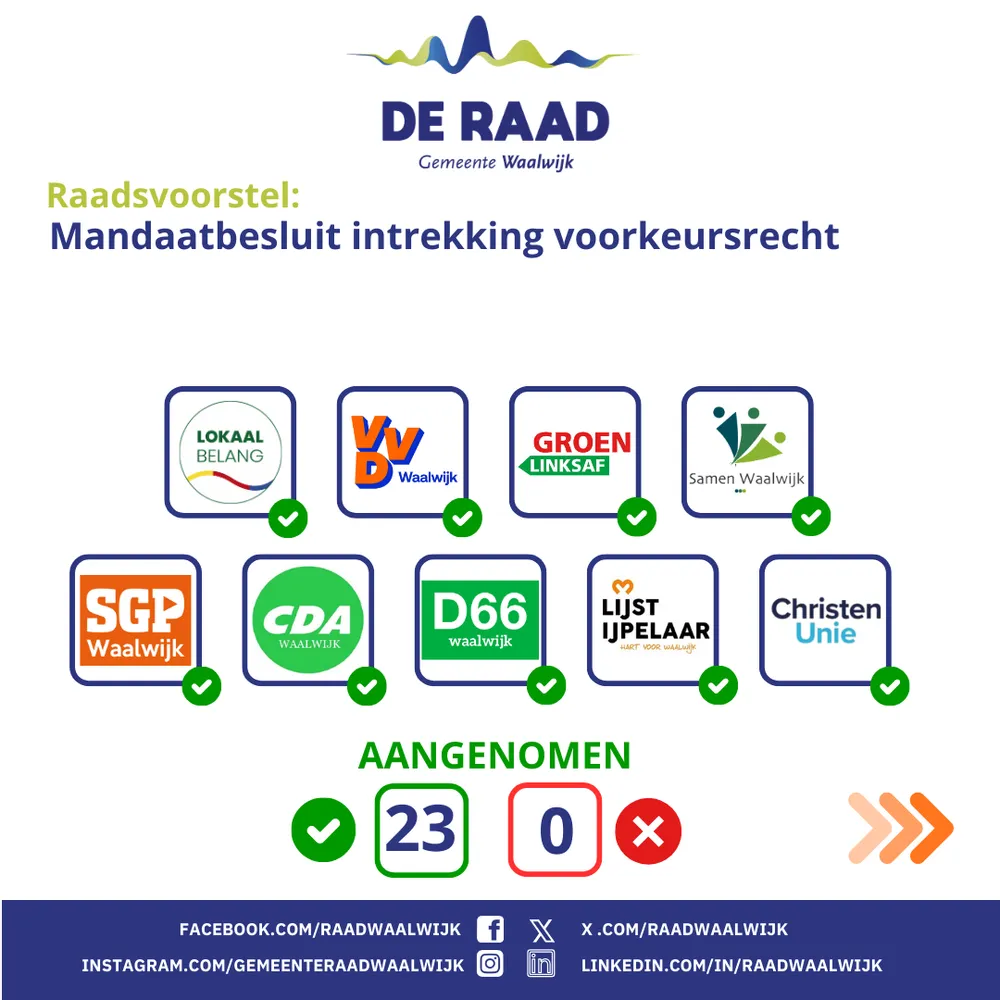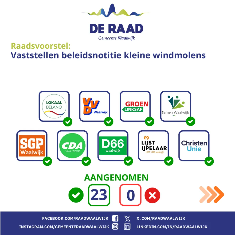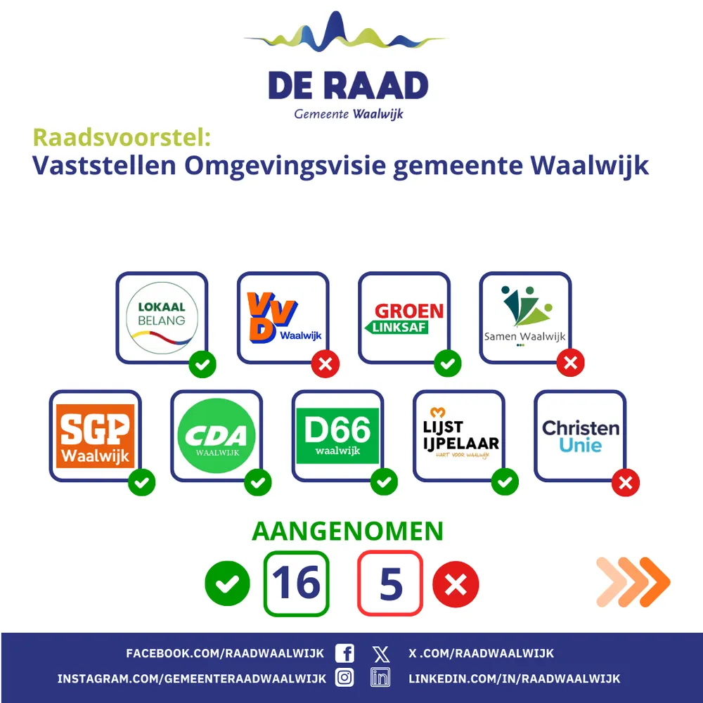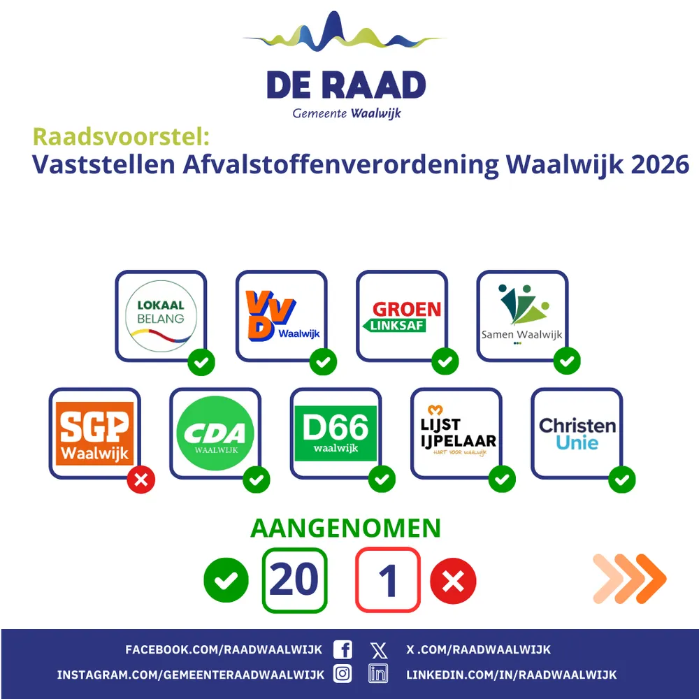 WAALWIJK - De gemeenteraad is de volksvertegenwoordiging van de gemeente Waalwijk. De raad vergadert volgens een vierweekse cyclus en komt iedere donderdagavond bijeen.