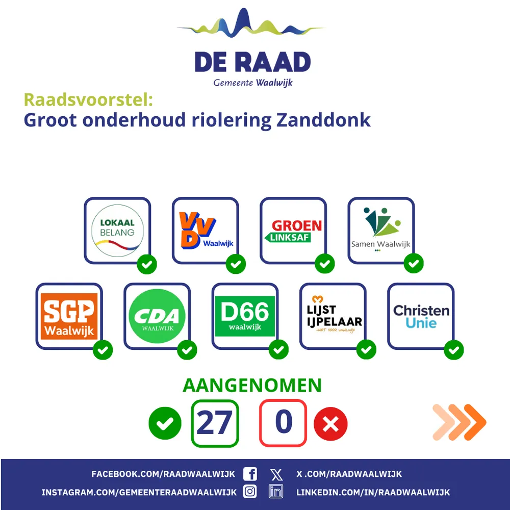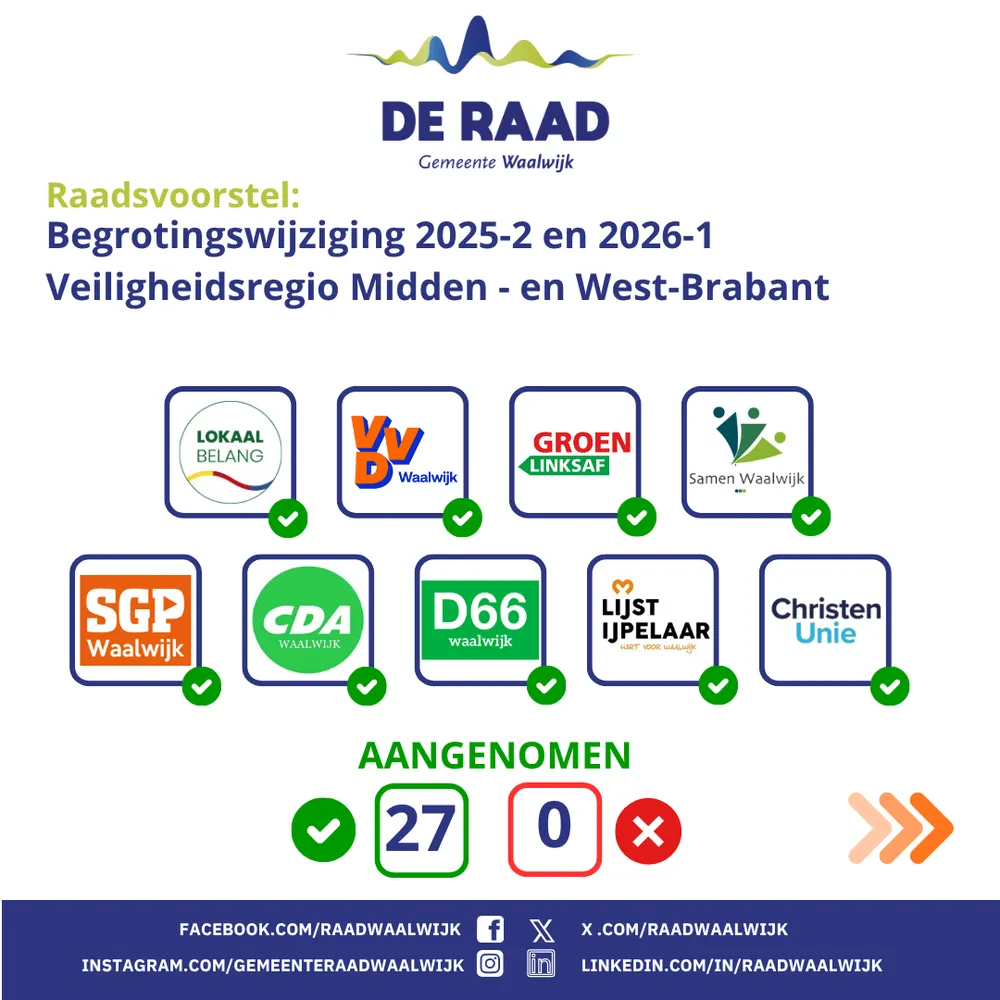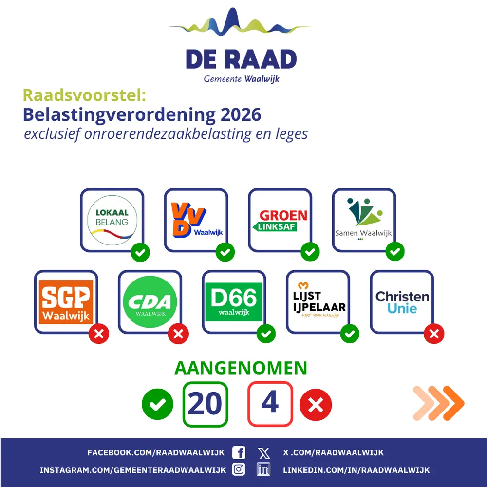 WAALWIJK - De gemeenteraad is de volksvertegenwoordiging van de gemeente Waalwijk. De raad vergadert volgens een vierweekse cyclus en komt iedere donderdagavond bijeen.