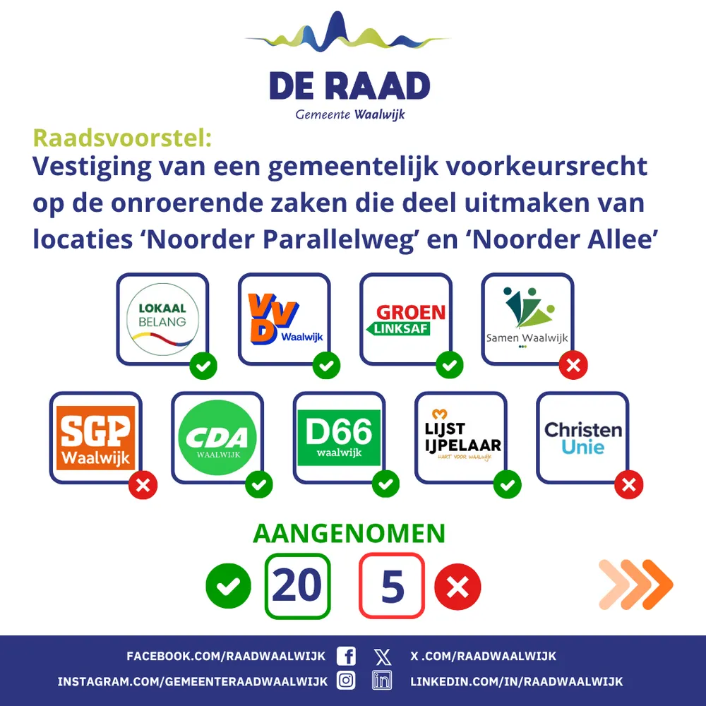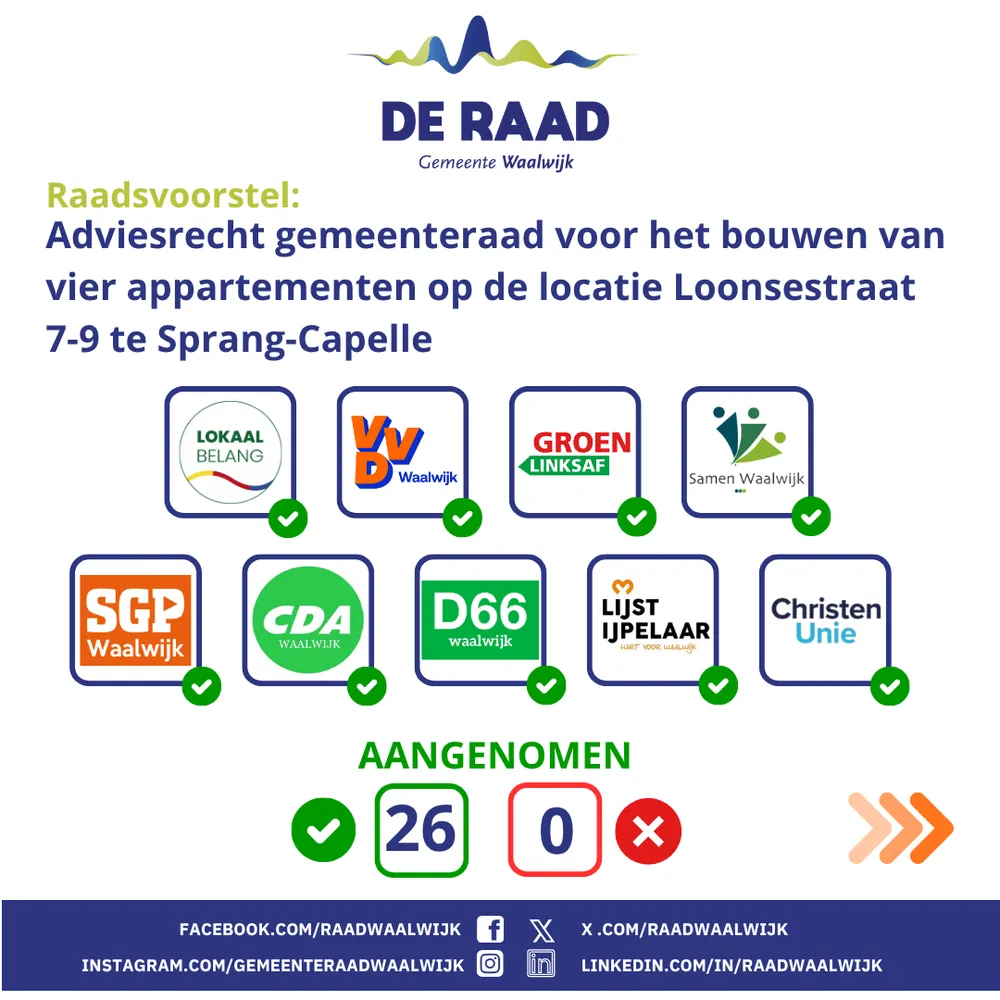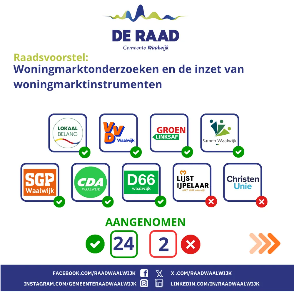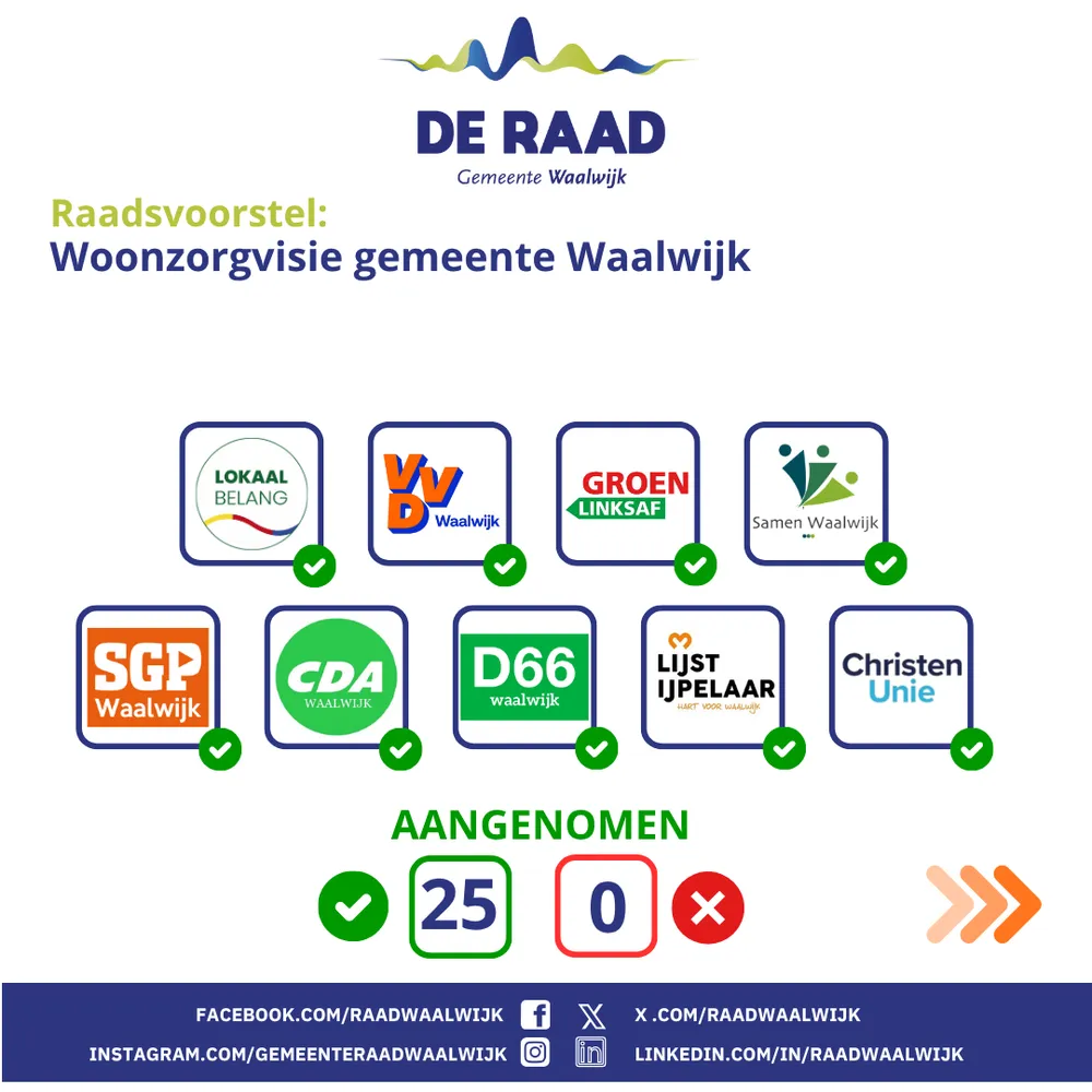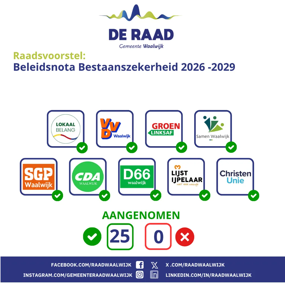 WAALWIJK - De gemeenteraad is de volksvertegenwoordiging van de gemeente Waalwijk. De raad vergadert volgens een vierweekse cyclus en komt iedere donderdagavond bijeen.