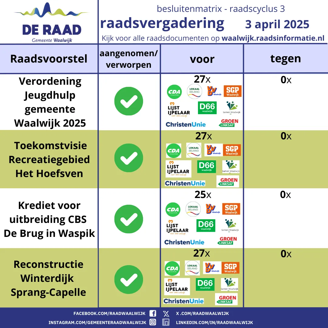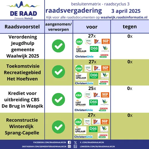 Hieronder de raadsbesluiten van 3 april 2025 (raadcyclus 3)