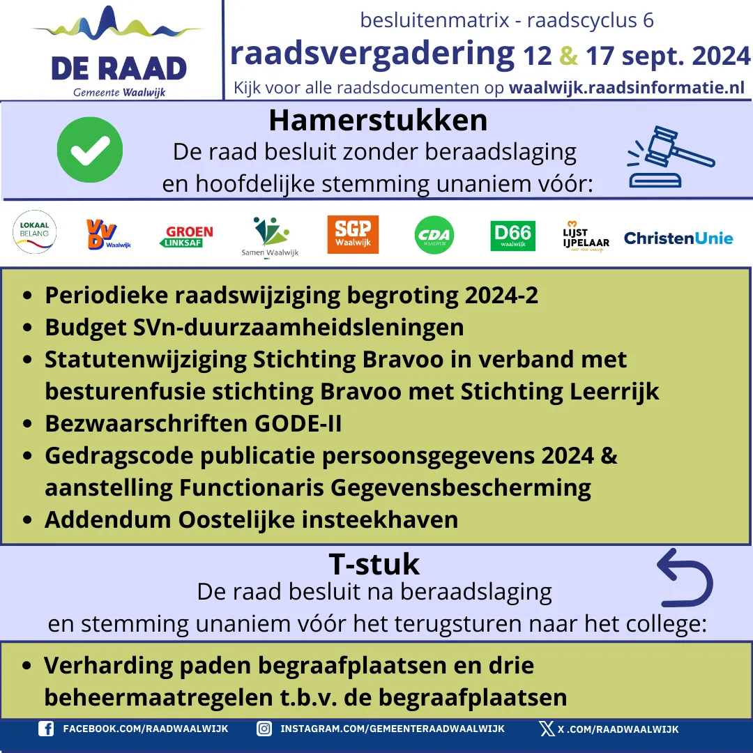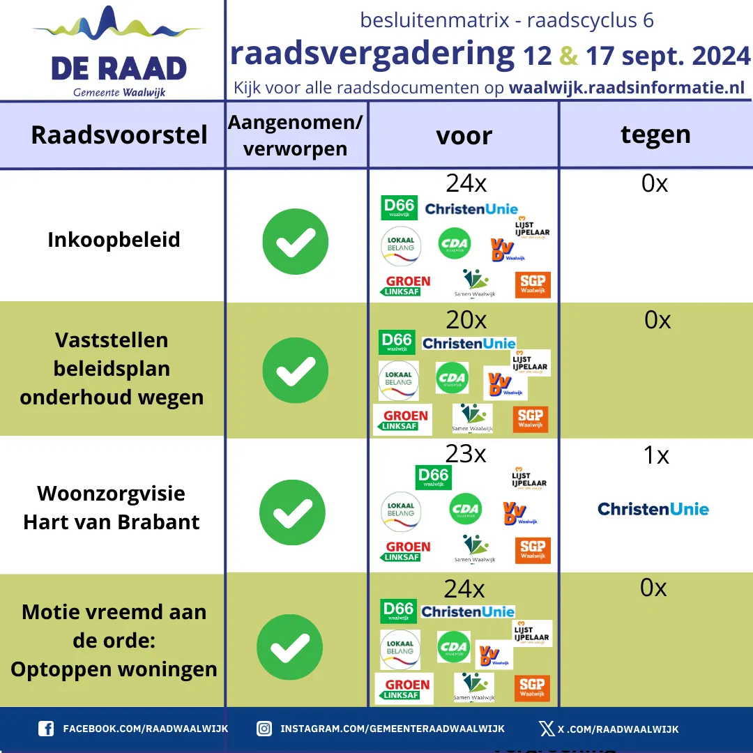Het sluitstuk van de vierweekse raadscyclus is de raadsvergadering. Namens de inwoners van Waspik, Sprang-Capelle en Waalwijk nemen de raadsleden besluiten. Besluiten die invloed hebben voor alle inwoners. De openbare raadsvergadering van donderdag 12 september was die avond niet helemaal klaar en werd op dinsdag 17 september afgerond.