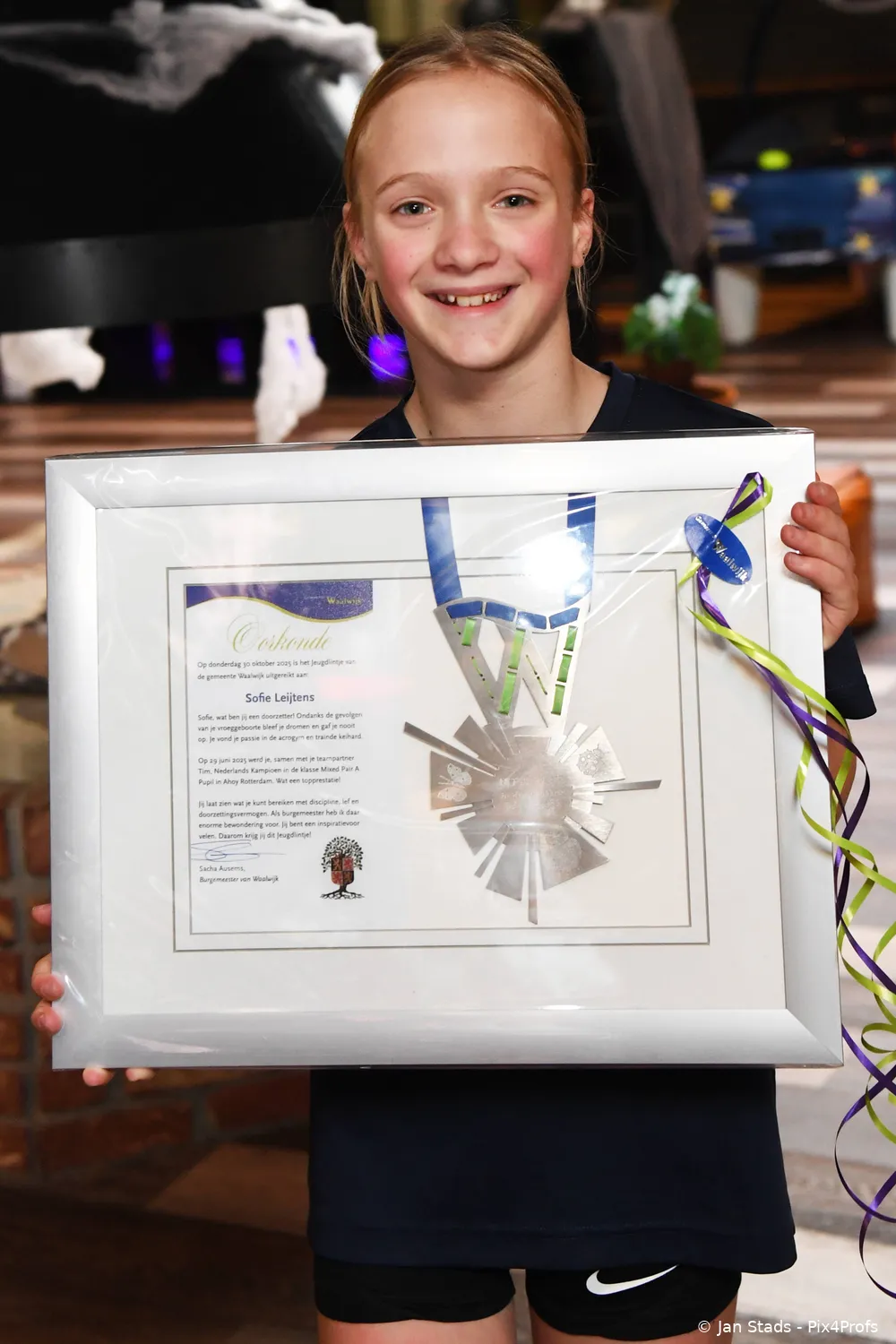 WAALWIJK – Burgemeester Sacha Ausems heeft donderdagmiddag 30 oktober het jeugdlintje van de gemeente Waalwijk uitgereikt aan Sofie Leijtens en Tim Passchier. Het duo ontving de eervolle onderscheiding voor hun bijzondere topsportprestatie: samen werden zij Nederlands Kampioen Gym- en Acrosport in de klasse Mixed Pair A Pupil tijdens een wedstrijd in Ahoy Rotterdam.