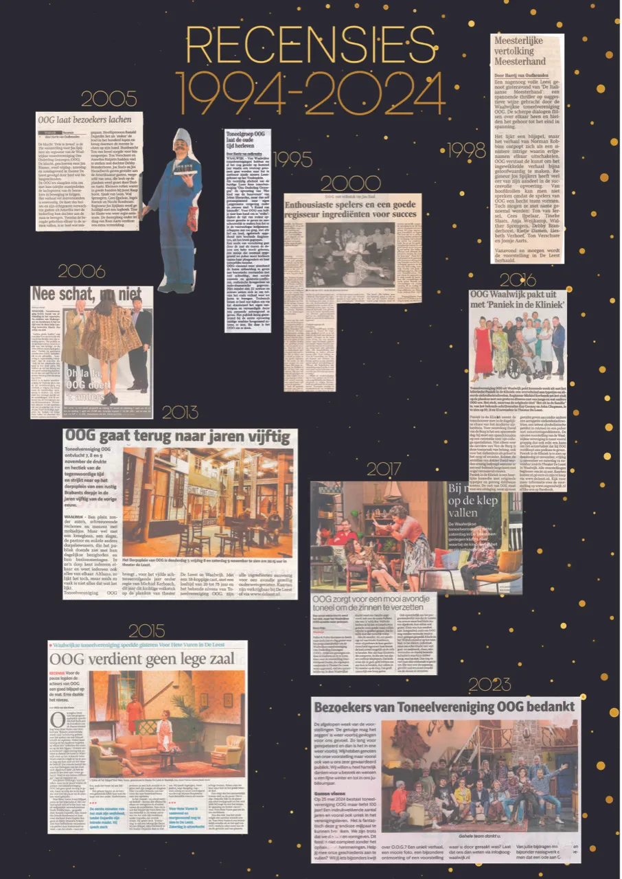 De tentoonstelling wekt vele herinneringen tot leven. Zo kunt u een deel van het decor bewonderen van ‘Het leven een leerschool’, hét pronkstuk van OOG. Dit stuk, voor het eerst uitgevoerd onder leiding van John Leddy in 1987, kende reprises in 1990 en 2003. Een absoluut hoogtepunt in 100 jaar OOG!