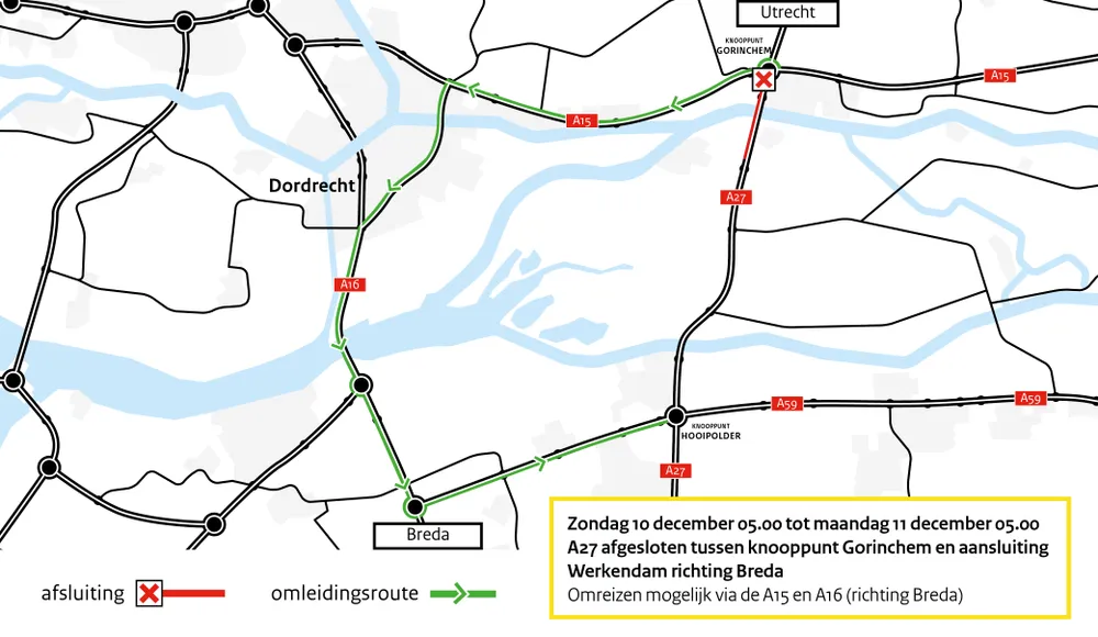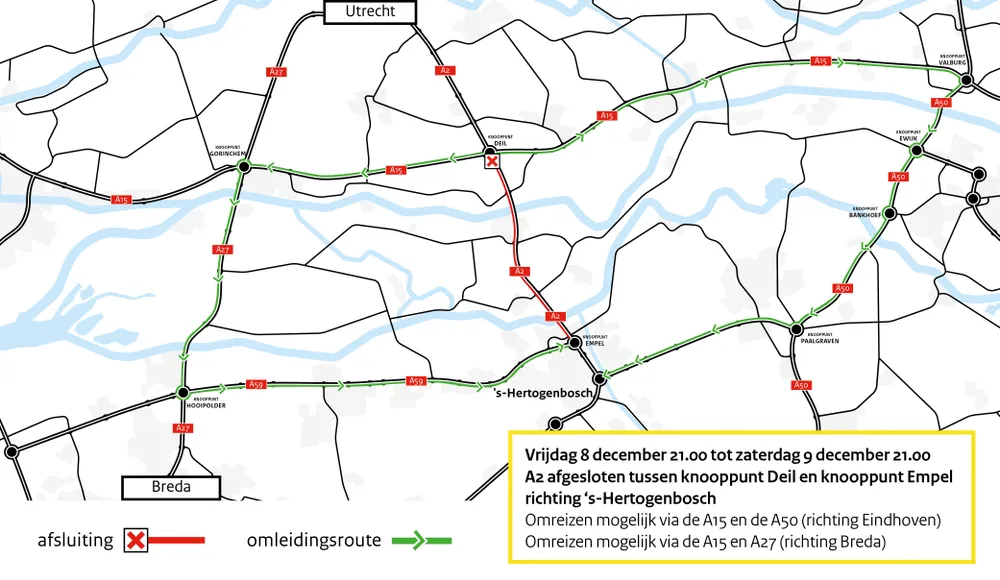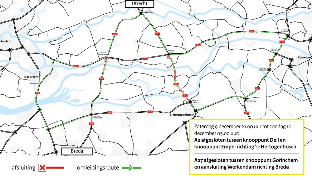 Tussen zaterdag 9 december 21.00 en zondag 05.00 uur zijn zowel de A27, tussen knooppunt Gorinchem en aansluiting Werkendam, als de A2, tussen knooppunt Deil en Empel, in zuidelijke richting afgesloten. Weggebruikers vanuit Utrecht richting ’s Hertogenbosch en Eindhoven kunnen omreizen via Nijmegen over de A15 en de A50. Weggebruikers vanuit Utrecht richting Breda kunnen omreizen via Dordrecht over de A15 en de A16.