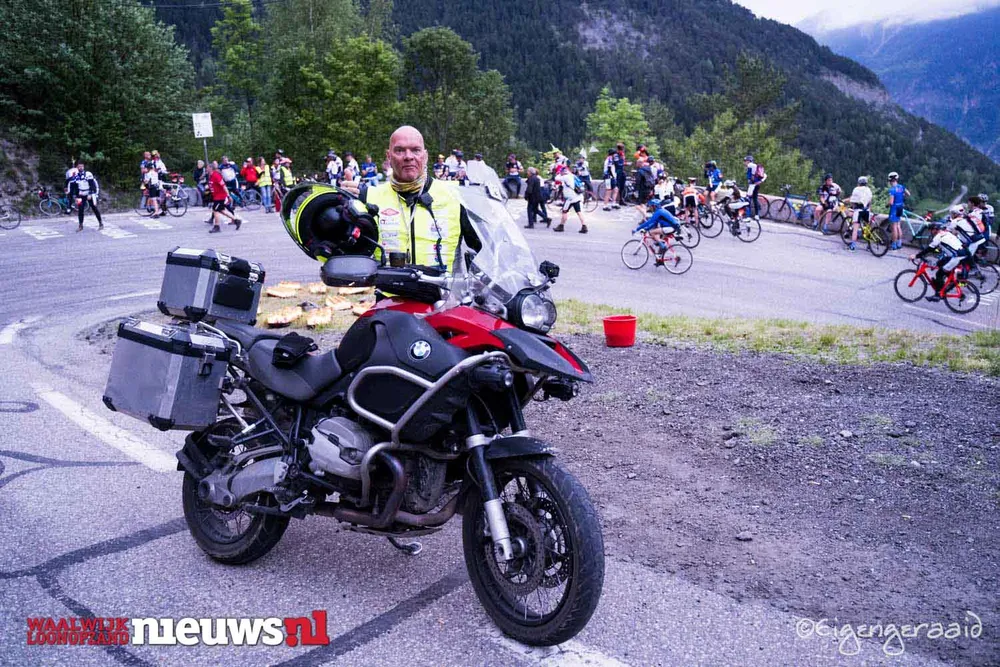 Als we daar aankomen, is het al erg druk aan de start. We lopen met de teams mee naar een grote rotonde. Vanaf daar begint de klim, voor mij het punt om de Motard op te zoeken. Ik stel me netjes voor en vraag of iemand me naar boven kan brengen. Marcel bood aan om me achter op de motor naar plek van bestemming te brengen. Ik kreeg een jas, helm en handschoenen aangereikt. Na een instructie hoe op deze hoge motor te klimmen, kon ik met de GoPro in de hand filmen.