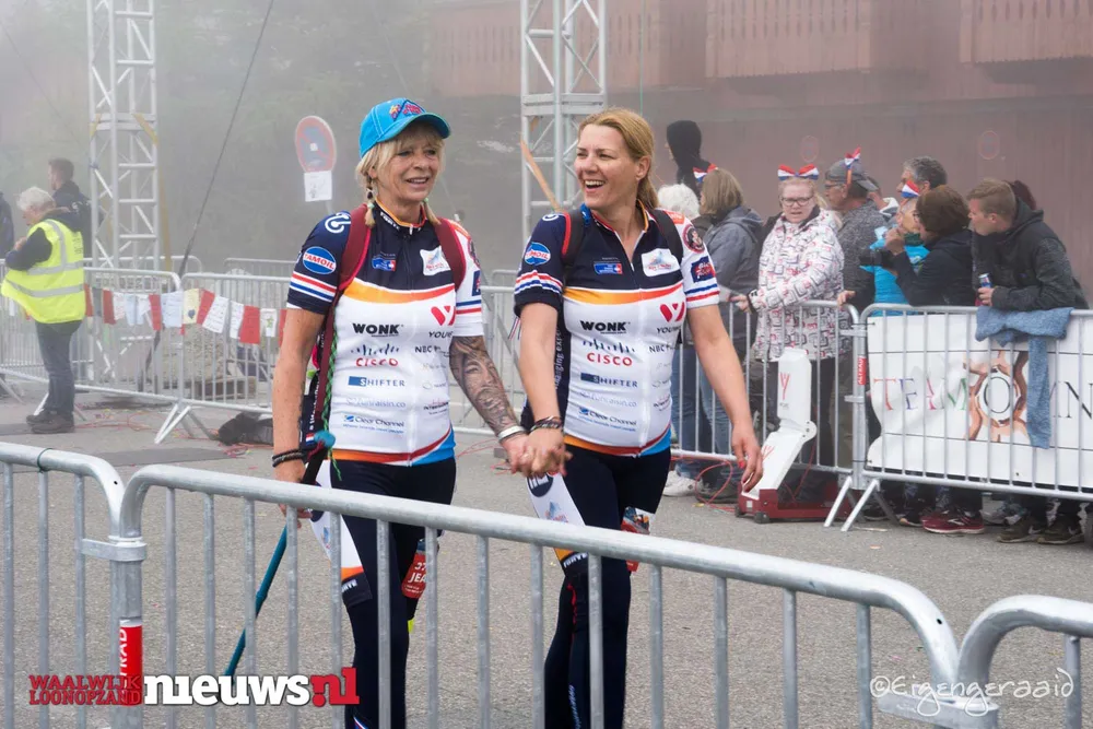 De muziek galmt ons tegemoet, de lachende en zwaaiende mensen staan langs de kant van de weg om de deelnemers aan te moedigen. We Never Wolk Alone heeft een tent opgezet met versnaperingen voor de mensen die langs komen. En dat wordt gewaardeerd. Je krijgt een groet terug, ziet een glimlach op een gezicht. Daarnaast stond Erwin in een tutu langs de kant van de weg. Een prachtig en lachwekkend gezicht.