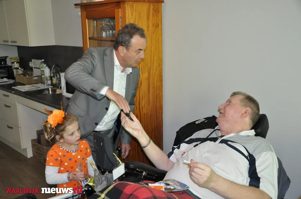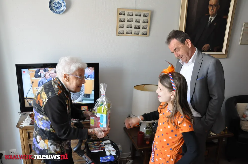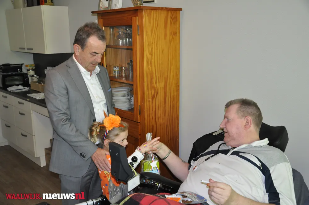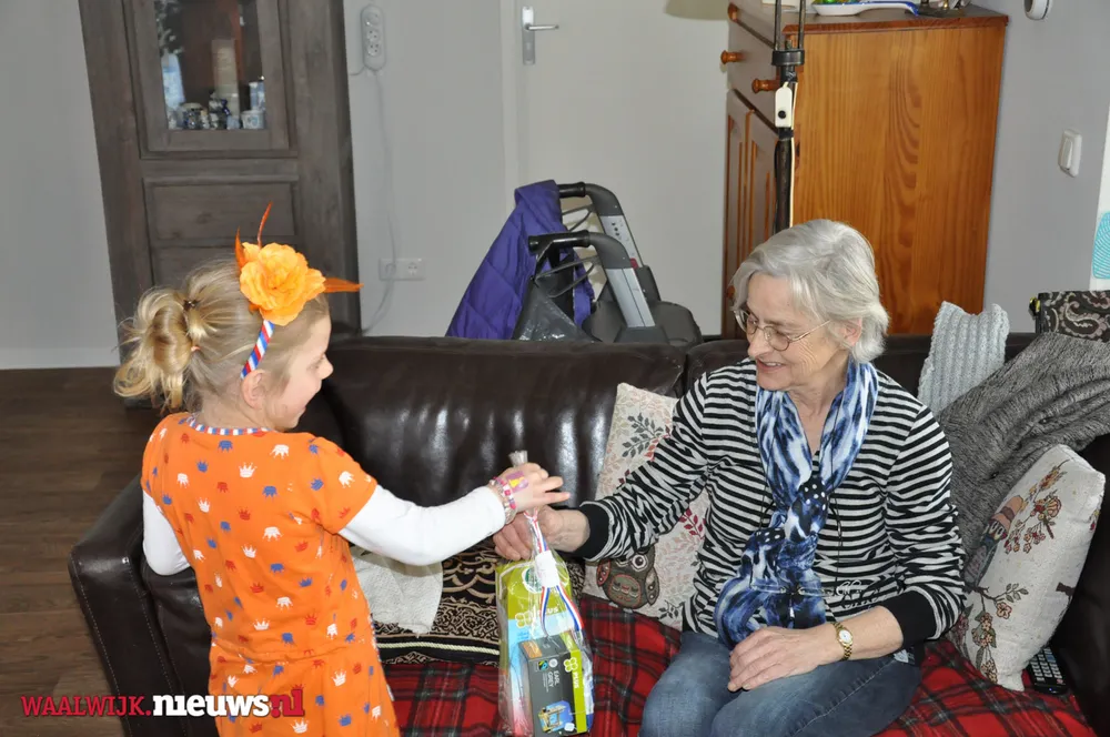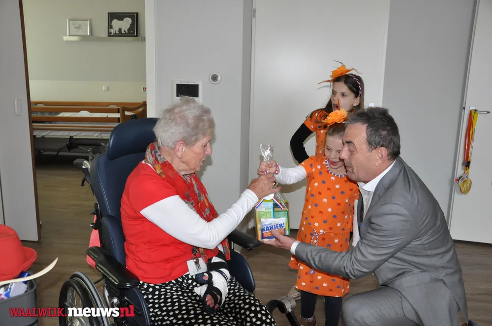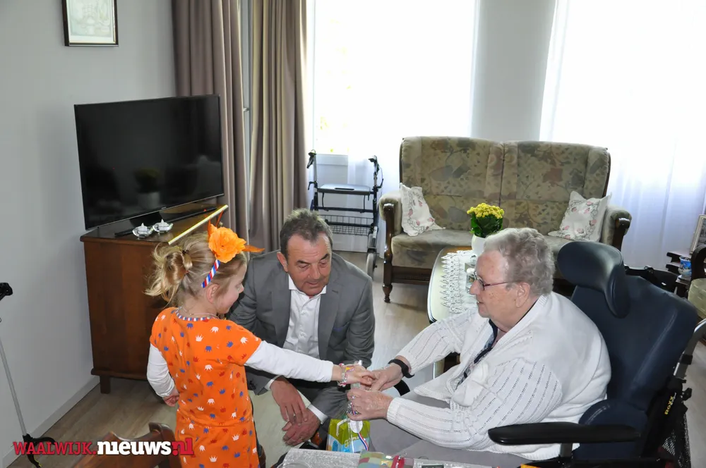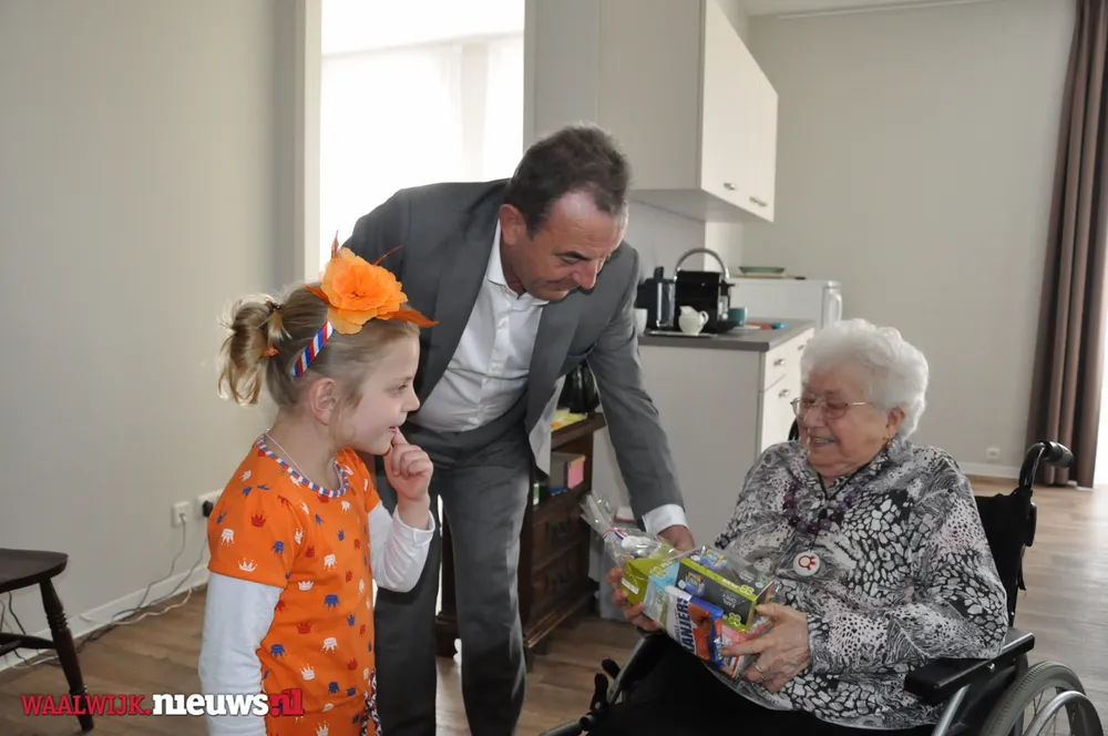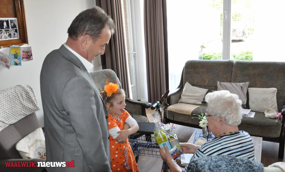 De burgemeester kreeg gezelschap van Jeannette Pol en Sjaan van Zelst (met kleindochters Cynthia en Charissa) van Vereniging Koninginnedag Besoyen en van Elma Toorenburg van Schakelring. Alle circa 175 65-plussers in Besoyen kregen een leuke Koningsdag-verrassing welke mede mogelijk werd gemaakt door Supermarkt PLUS Van Engelen. Dit leverde uiteraard mooie fotomomenten op met de bewoners van Spoorwiel.