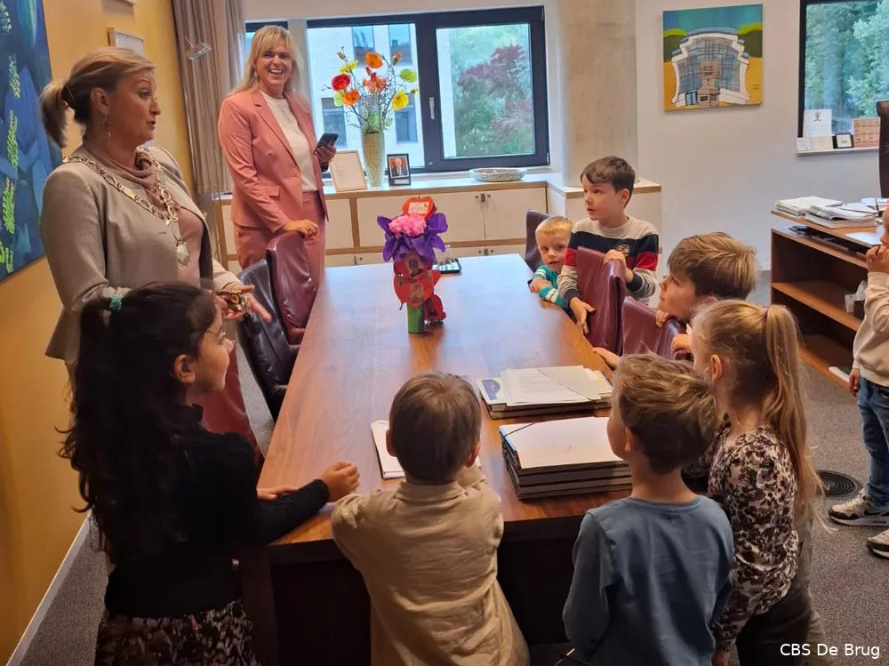 De burgemeester kreeg van de klas een zelfgemaakt cadeau, speciaal voor haar gemaakt. Na het ontbijt mochten de kinderen een kijkje nemen in de werkkamer van de burgemeester. Sterker nog, ze mochten achter haar bureau op haar stoel zitten en rondjes draaien. Samen zochten ze een mooi plekje uit voor het cadeau. De kinderen keken hun ogen uit en stelden talloze vragen, zoals waar het bed van de burgemeester nu was.