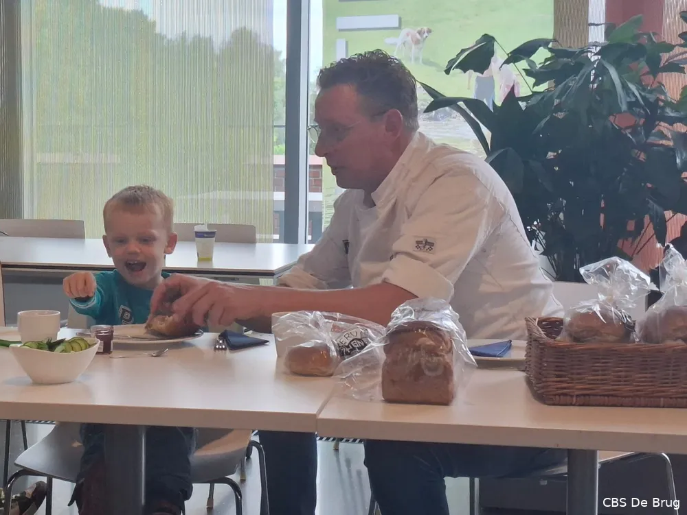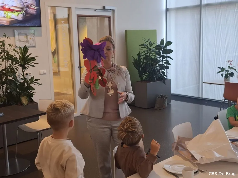 Speciaal voor het bezoek had de burgemeester roze glitterschoenen aangetrokken, wat het geheel nog feestelijker maakte. De leerlingen mochten mee naar het restaurant van het gemeentehuis, waar bakker Tim van Bakkerij van Beijnen het gezelschap al opwachtte met een prachtig gedekte tafel.