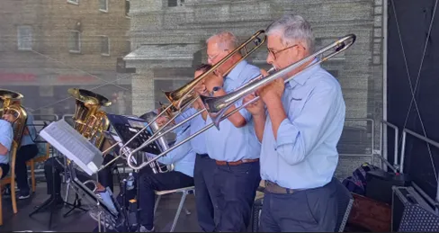 Na ruim 2,5 uur rijden zonder files arriveerde de bus in het centrum van Unna, bij de Seniorentreff, het centrum voor ouderen, waar een lunch met Brötchen, Bratwurst en Kartoffelsalat al klaarstond. Tijdens de lunch heette de burgemeester ons welkom en herinnerde aan de goede, al jaren bestaande band tussen Unna en Waalwijk. Na de lunch werden de instrumenten uitgepakt en vertrok de kapel naar het 100 meter verderop gelegen Markt, waar het podium al klaarstond. Het plein zat om 13.00 uur vol met honderden opa’s en oma’s, kinderen en kleinkinderen. Begonnen werd met de Jungbläser Mars, het bekende openingsnummer van de kapel. Daarna volgden onder andere nummers als Hallelujah van Leonard Cohen, een potpourri van nummers van Bert Kaempfert en een rumba. Speciale aandacht was er voor de trompettisten in het nummer Träumende Trompeten en voor de saxofonisten bij Saxophone Jubilee. Na de pauze werden moderne nummers als Happy Luxemburg en Your Place or Mine gespeeld, maar ook het grappige Egerländer nummer Auf der Vogelwiese. Het was warm op het podium dankzij het fraaie weer, maar het optreden verliep prima. Na een uur kregen de muzikanten een luid en welverdiend applaus en was er gelegenheid om iets te drinken rond de Markt of het centrum met de vakwerkhuizen te bekijken. Leuk was dat een van de bezoekers vroeg om volgend jaar een bepaald muziekstuk in te studeren!