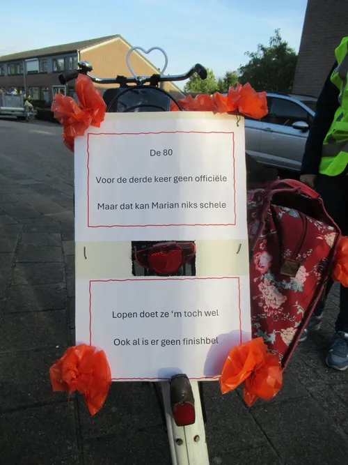 Ze vertrok om 18:30 uur vanuit haar woning, gelegen in de buurt van de Raadhuisstraat. Haar route voert haar eerst richting Waspik, waarna ze doorloopt. Ze hoopt morgen rond het middaguur haar ronde van 80 kilometer weer thuis af te ronden.