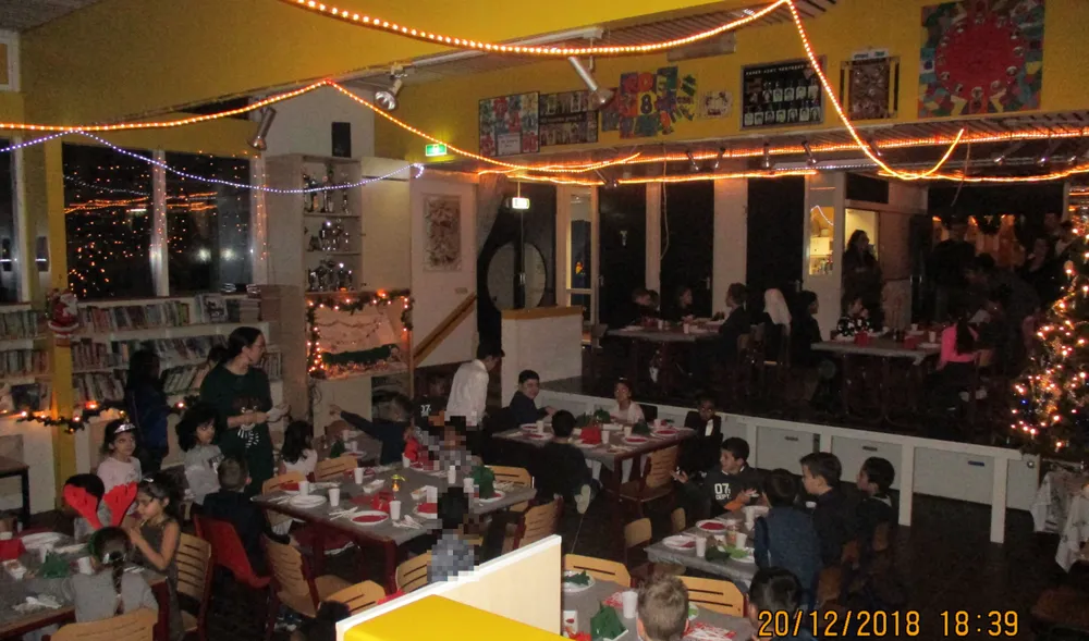 Het bijzondere aan het diner op OBS Van der Heijden is dat ze het met zijn allen samen doen. De kinderen van peuterspeelzaal Kiekeboe waren erbij. In en rond de aula waren alle tafels prachtig gedekt waren. Elk tafelgroepje had zijn eigen symbool in de kerstsfeer: een rendier, een ster, een kerstbal. Op tafel stonden zelfgemaakte naamkaartjes zodat de kinderen hun plekje gemakkelijk konden vinden. De kinderen van de school zaten helemaal verspreid door de aula en de gang. De peuters zaten in de speelzaal aan mooi gedekte tafels. Aan tafel zaten kinderen van alle groepen, zodat de oudere leerlingen de jongsten konden helpen. Zo vieren wordt kerst echt samen gevierd!