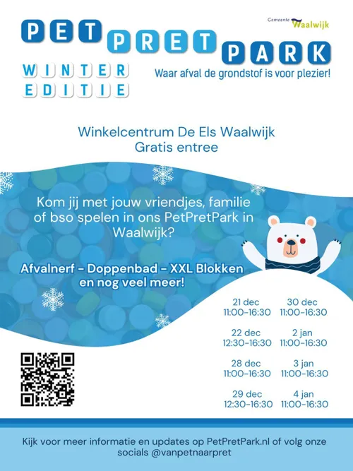 WAALWIJK - Tijdens de kerstvakantie opent het pop-up PetPretPark in Winkelcentrum De Els in Waalwijk. Het park biedt een unieke ervaring waarbij afval de grondstof is voor plezier. Bezoekers kunnen gratis deelnemen aan diverse activiteiten, zoals ontspannen in het doppenzwembad, afval schieten met Nerf, deelnemen aan een wedstrijd zwerfafval grijpen of duurzaam bouwen met blokken. Het park is geschikt voor gezinnen, kinderen en groepen.