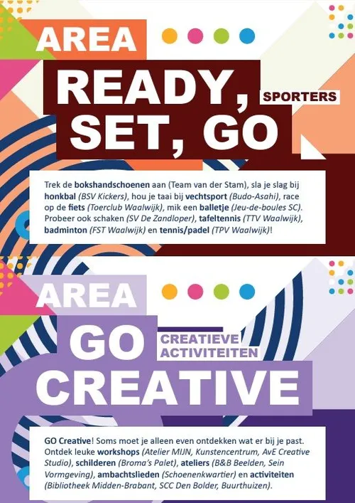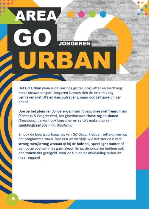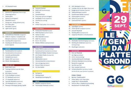 Op zondag 29 september organiseert GO Waalwijk de 4e editie van het GO Waalwijk Festival. Kom en doe mee met sport, beweging, dans, muziek, geniet van theater, kunst en nog veel meer. Voor iedereen is er wel iets interessants om te zien, doen en ontdekken! De toegang tot het GO Waalwijk Festival is GRATIS.