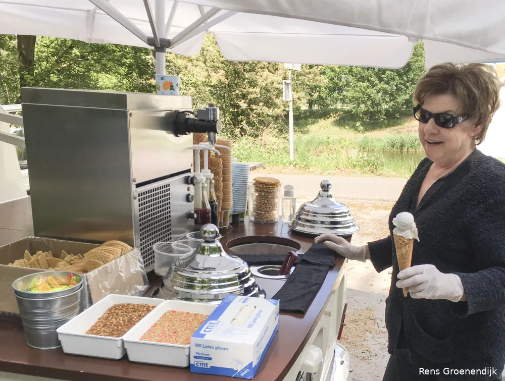 Het prachtige autootje, schitterend weer, plus fietsers en wandelaars die een ijsje verorberen, zorgen ervoor dat er aan de lopende band klandizie is. “Het is wel wat anders dan bij een evenement, dan staan er lange rijen“, zegt Coby, die er alleen aan moet wennen dat sommige mensen uit vrees voor besmetting niet met contant geld willen betalen. Een voorbijganger vertelt haar dat je voor 25 euro in webshops een pinautomaatje kunt kopen. “Ik verkoop al 30 jaar schepijs tegen contante betaling, maar nu moet ik dan toch eens gaan beginnen aan het pinnen.” Coby is van plan elk weekend op deze plek ijsjes te gaan verkopen.