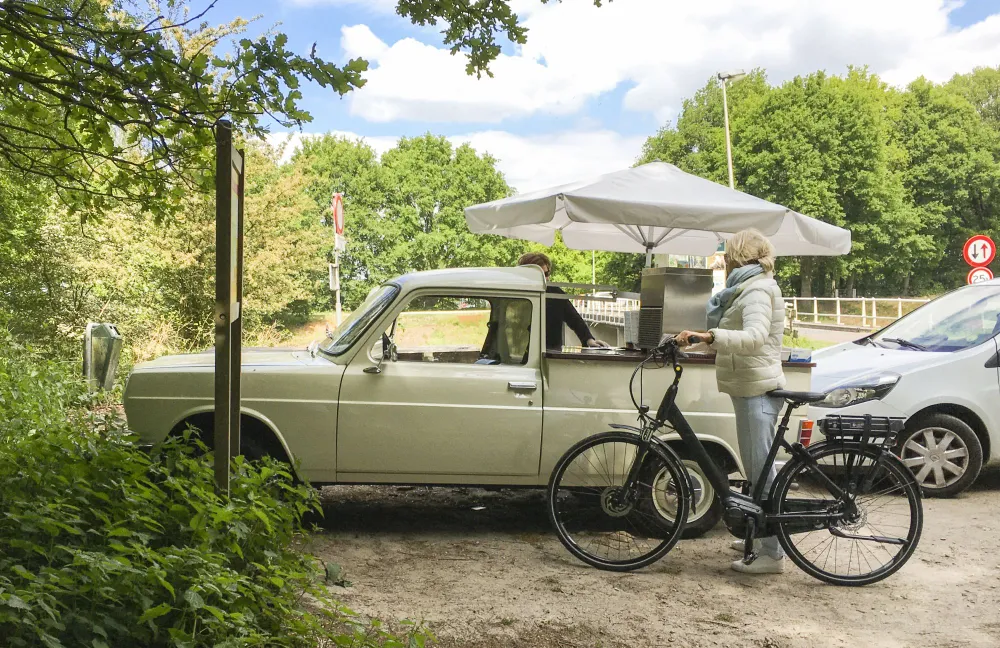 DRUNEN - Bij de kruising van het fietspad langs het Afwateringskanaal en het Steegerf in Drunen stond zondag een opmerkelijk ijscokarretje met parasol, een roomwitte Simca 1100 Fourgonnette uit 1976.